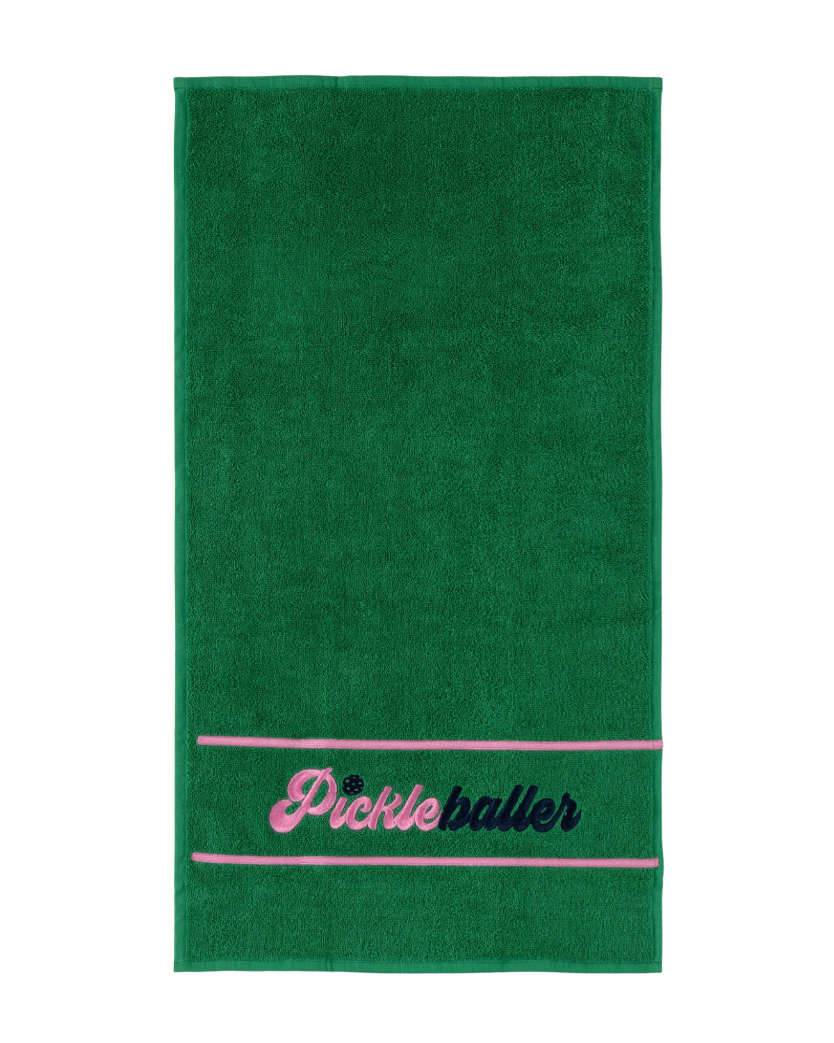 Serve up style with this playful green hand towel featuring "Pickleballer" in vibrant pink and blue embroidery. Soft cotton construction makes it perfect for the court or as bathroom décor. An ideal gift for pickleball lovers who want to show their game pride.