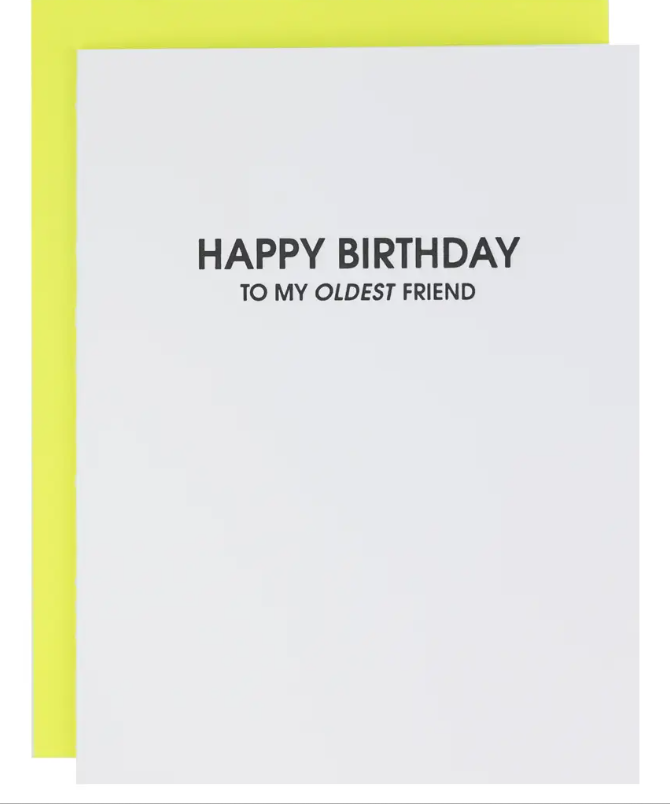 The "Happy Birthday, To My Oldest Friend." card is letterpress printed on a vintage printing press in sunny California.