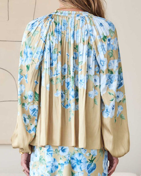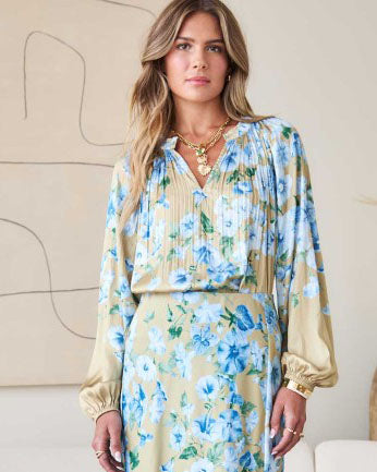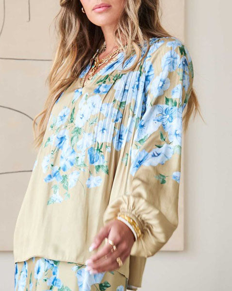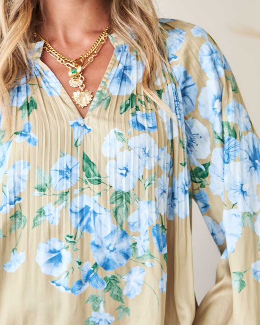 This pretty floral print blouse features a split v-neckline with pleating detail on the front and back, long sleeves and a flowy, relaxed fit. A must for work or play.