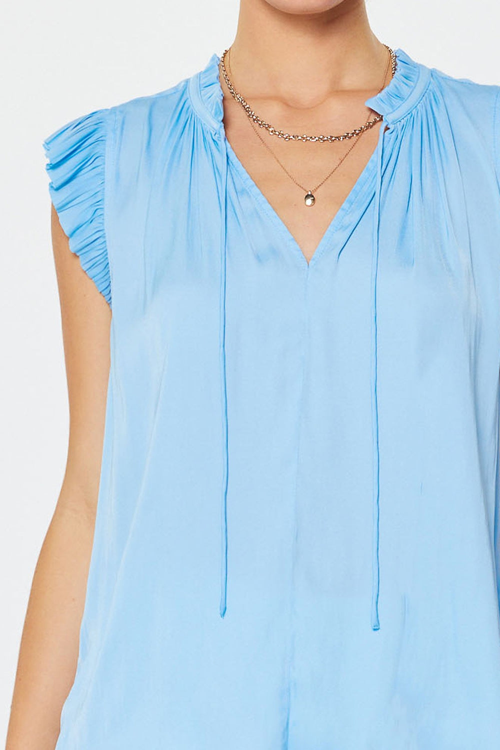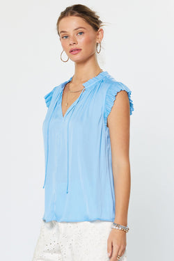 This blouse showcases pleated short sleeves and a ruffled split neckline with adjustable self-tie detail. Crafted in a serene pastel blue, it effortlessly transitions from office to evening wear.