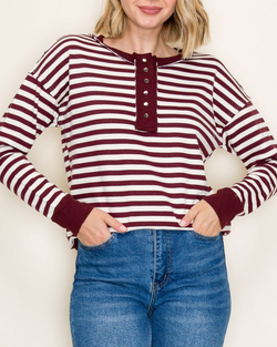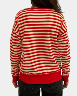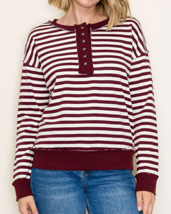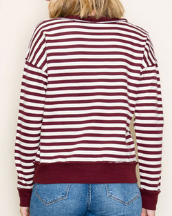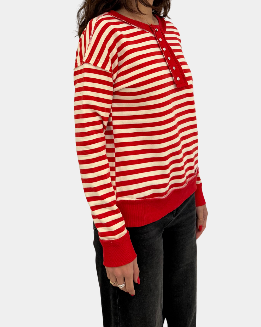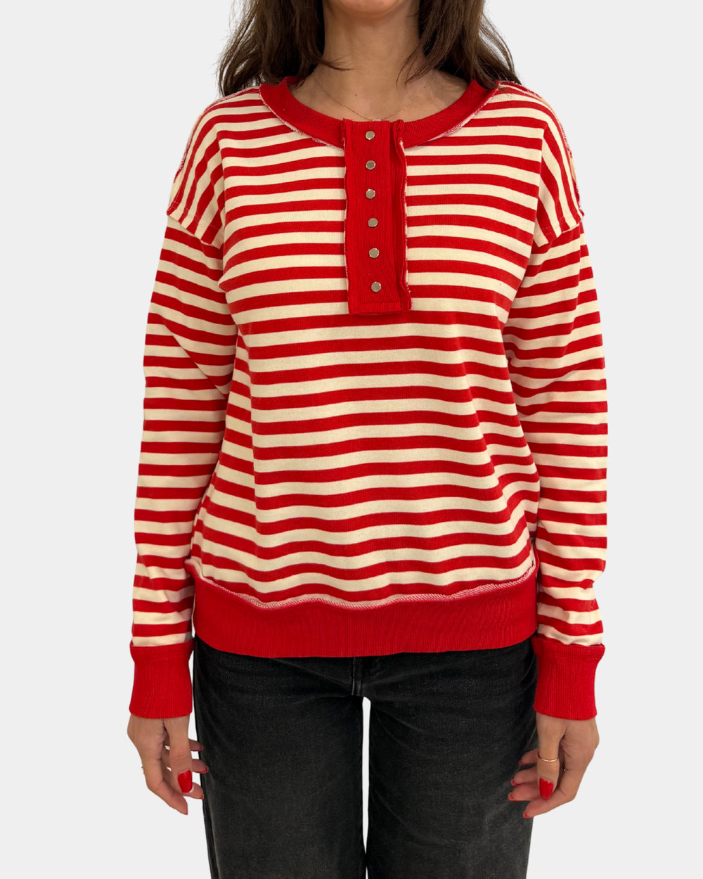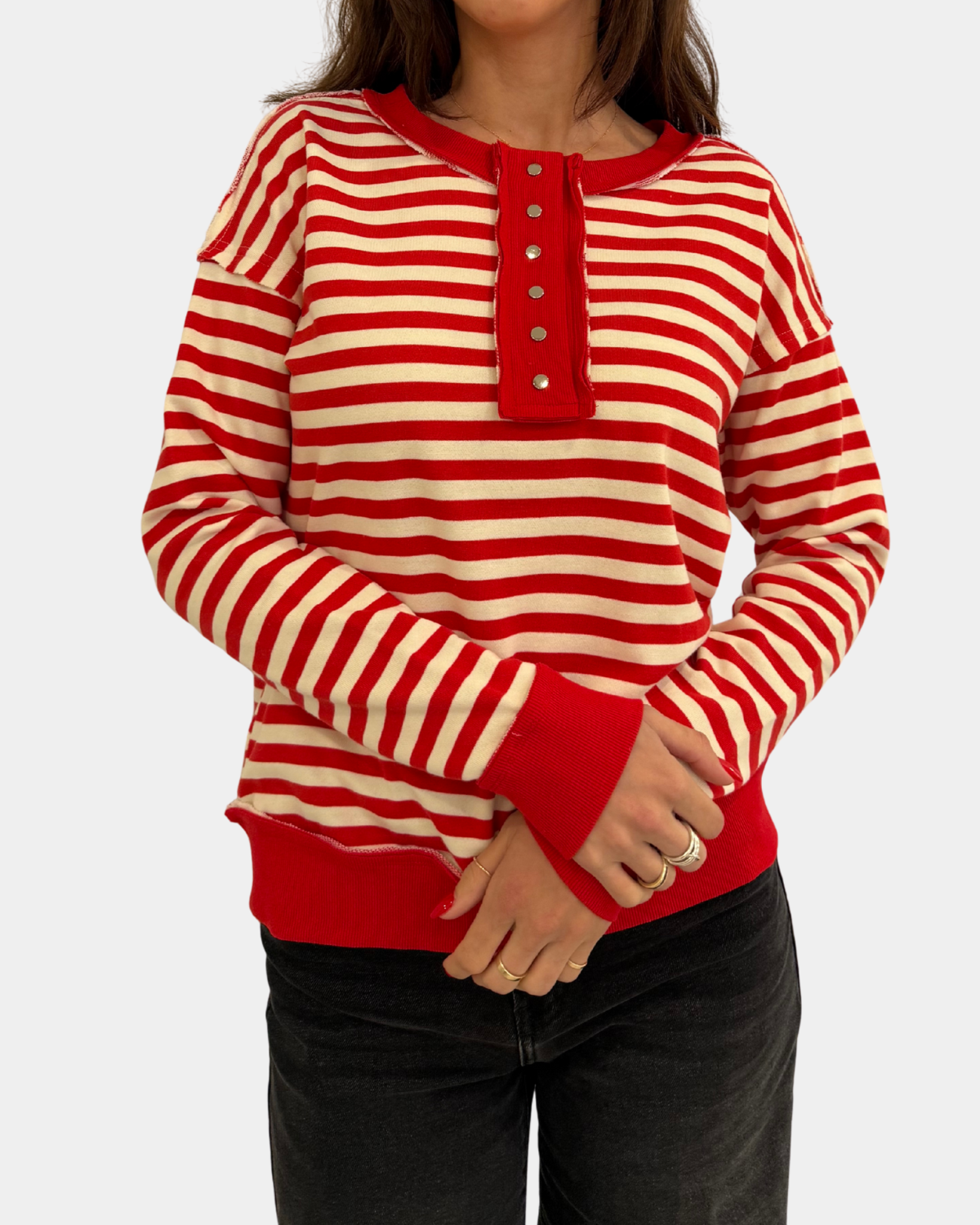 Add a pop of fun to your outfit with this red stripe pullover featuring cute snap buttons for easy style upgrades. Cozy, colorful, and ready to brighten your day—snapping into comfort has never looked this good!
