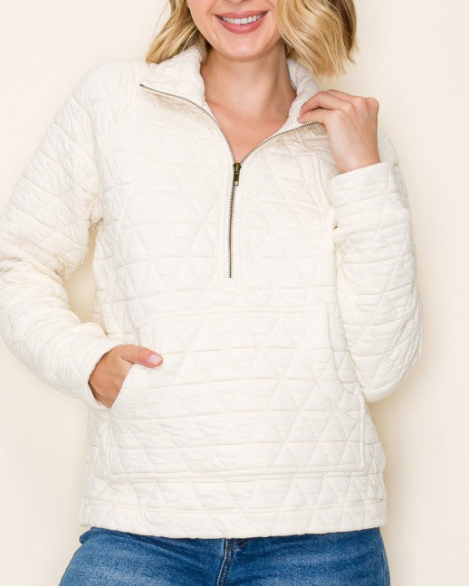 Get ready to cozy up in style with this charming cream quilted sweatshirt! Featuring a fun half-zip and polar neck, it’s perfect for those crisp fall days. The long sleeves and kangaroo pocket add extra warmth and a playful touch, making it your go-to for comfy, casual vibes all season long.