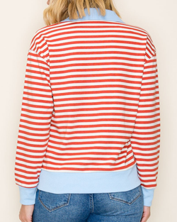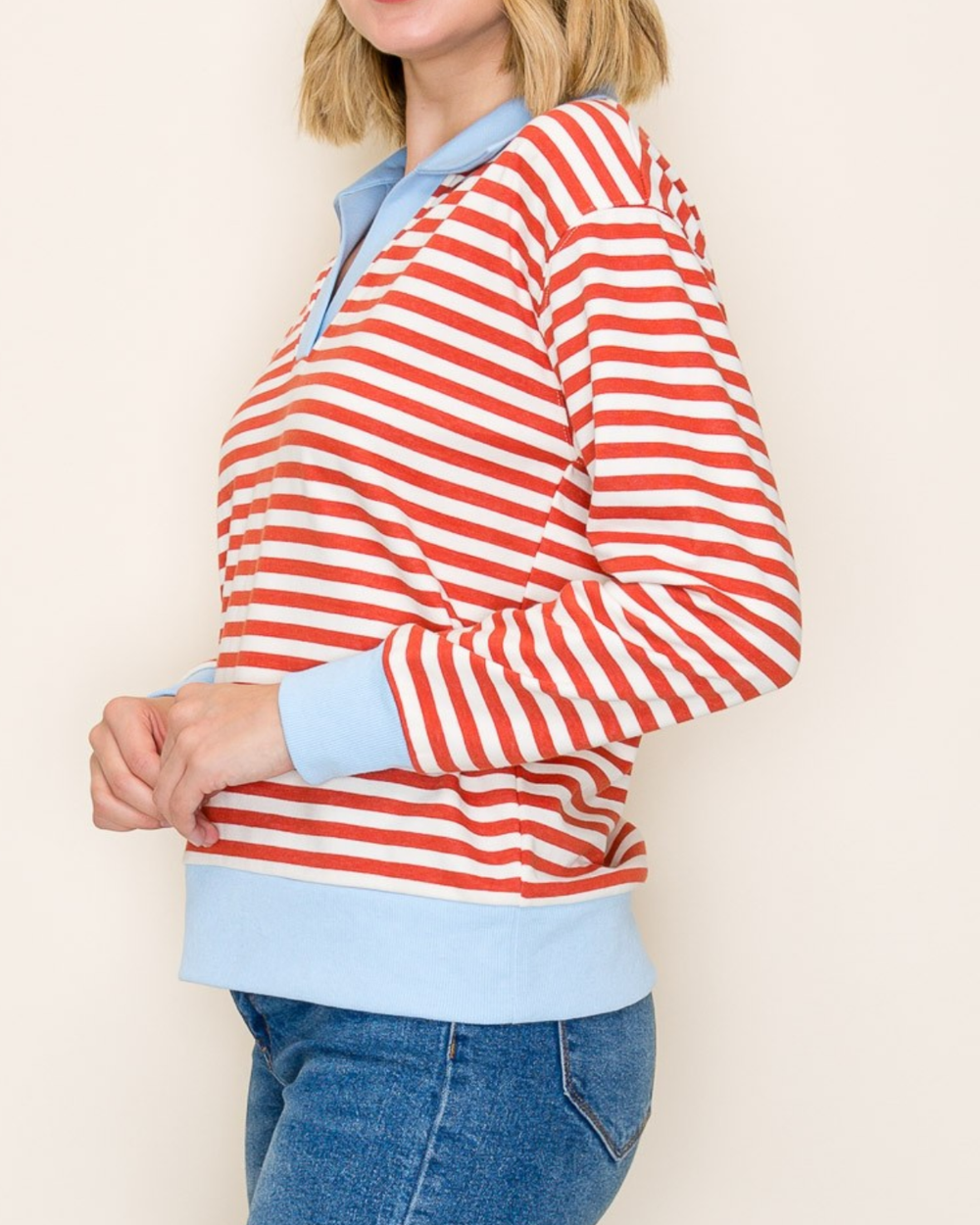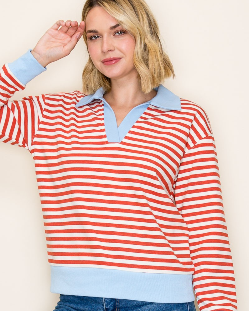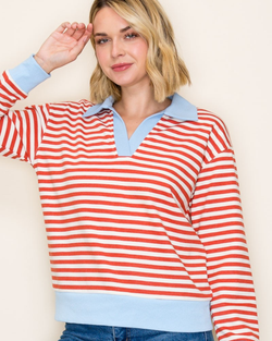 Mix and match your moods with this vibrant color-block pullover! Featuring bold orange and blue stripes with a crisp point collar, it's the perfect piece to add personality to your everyday rotation.