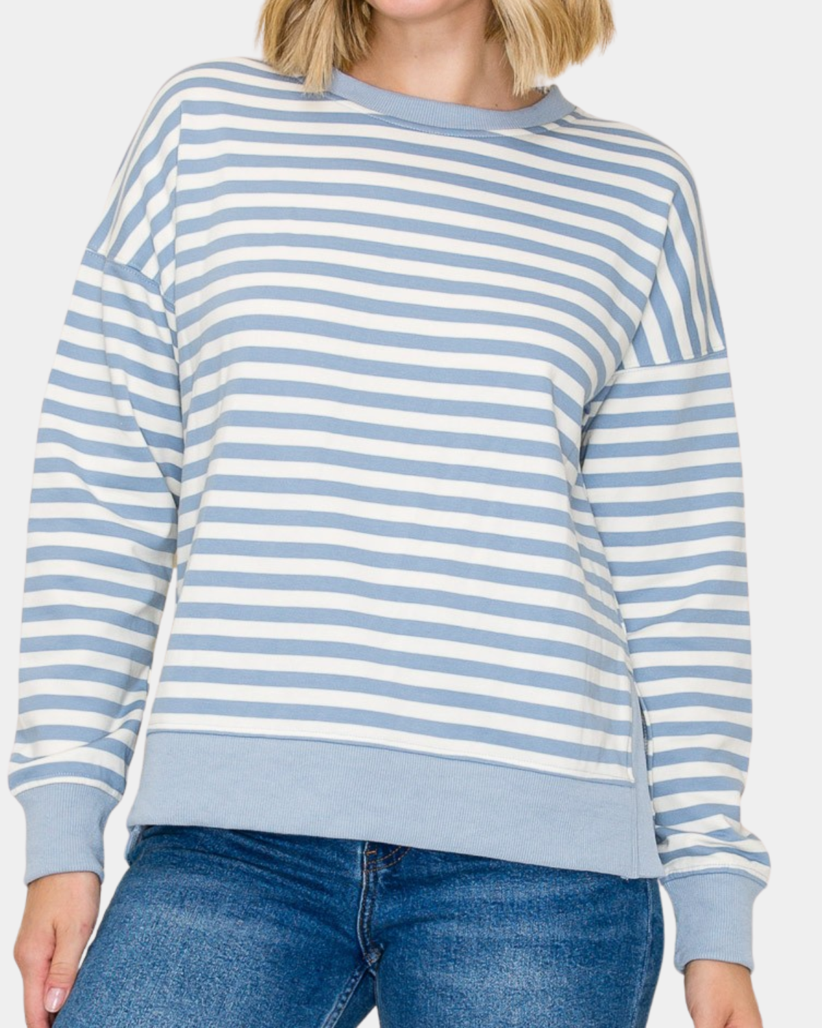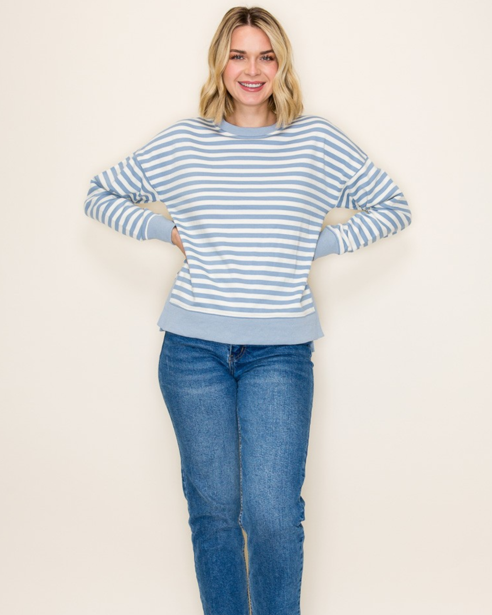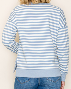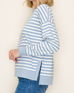 Effortless style meets comfort in this breezy pullover! The playful stripe pattern and cheeky side slits add movement and personality to your everyday look. Sky blue keeps things fresh and versatile.