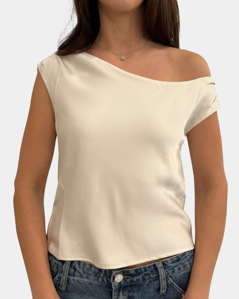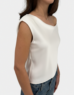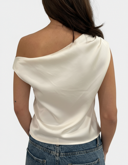 Elevate your wardrobe with this refined asymmetrical satin top in soft ecru. The sleeveless silhouette and fluid drape create an effortlessly chic look, perfect for layering or wearing solo. A versatile piece that transitions seamlessly from day to evening.