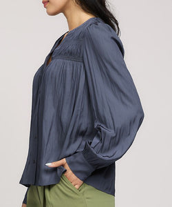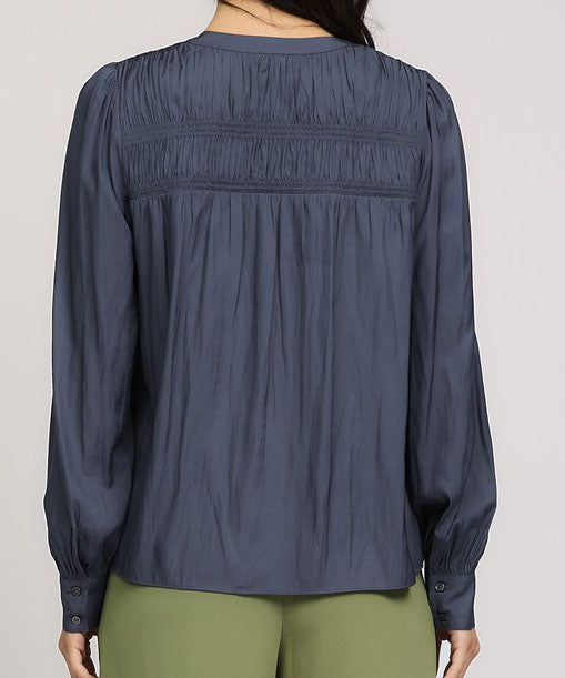 This classic button down blouse features a split v-neckline, smocking detail on the shoulder and back yoke and long sleeves. A best selling silhouette that is timeless and chic.