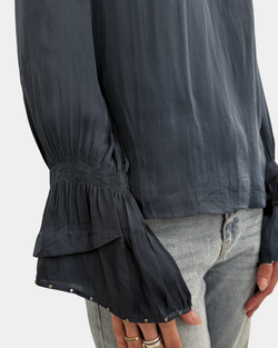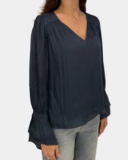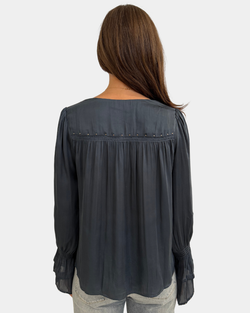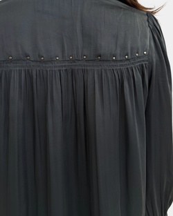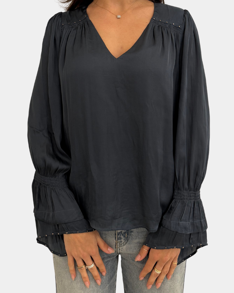 Elevate your everyday look with this navy shoulder studded blouse featuring a flattering V-neckline. The edgy stud detailing adds just the right amount of attitude, making it perfect for dressing up basics or standing out at casual gatherings. Versatile, bold, and undeniably chic.