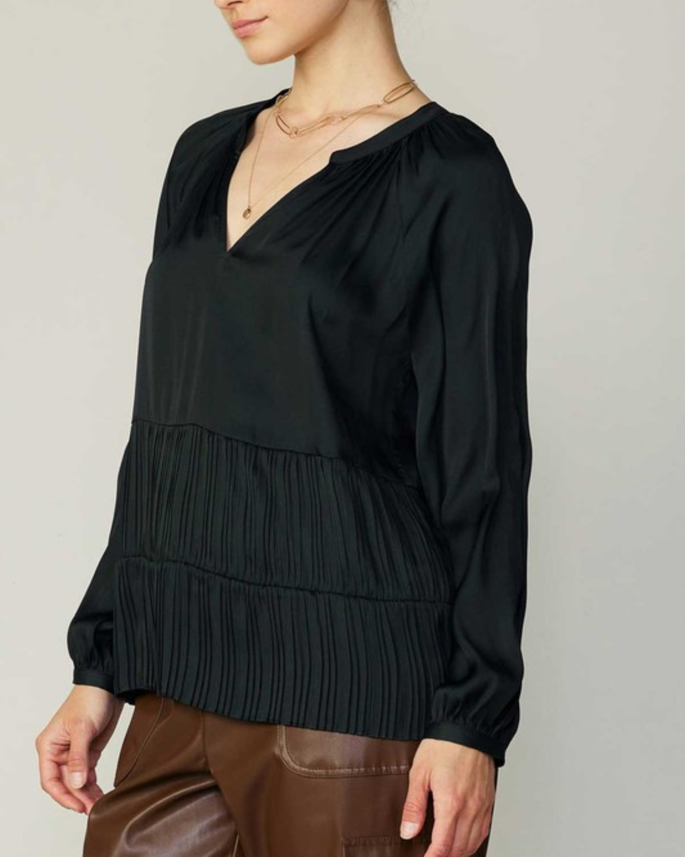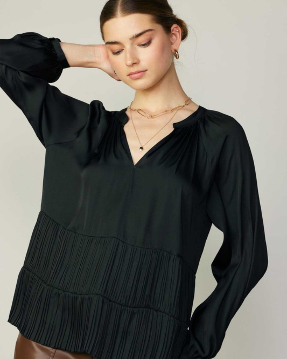 Flowy layers meet modern edge in this split-neck long-sleeve top. The tiered bottom adds movement and dimension, perfect for mixing casual vibes with contemporary style. A versatile piece that works as hard as you do.