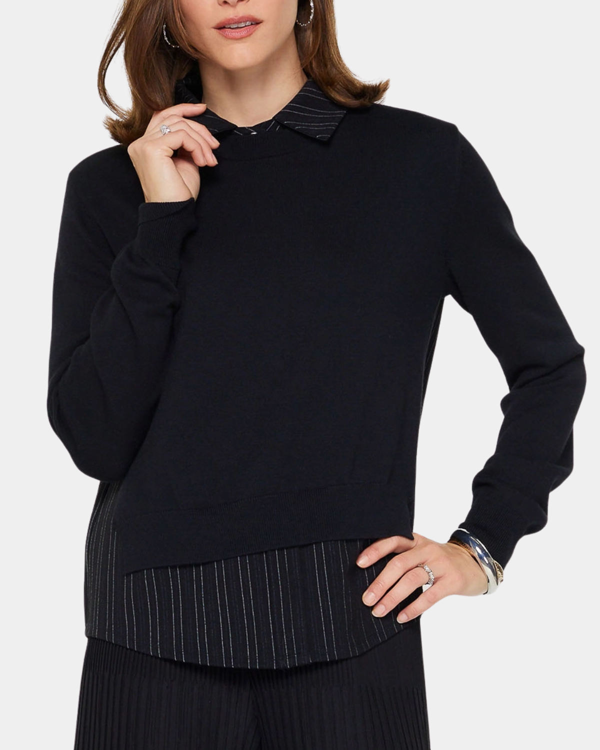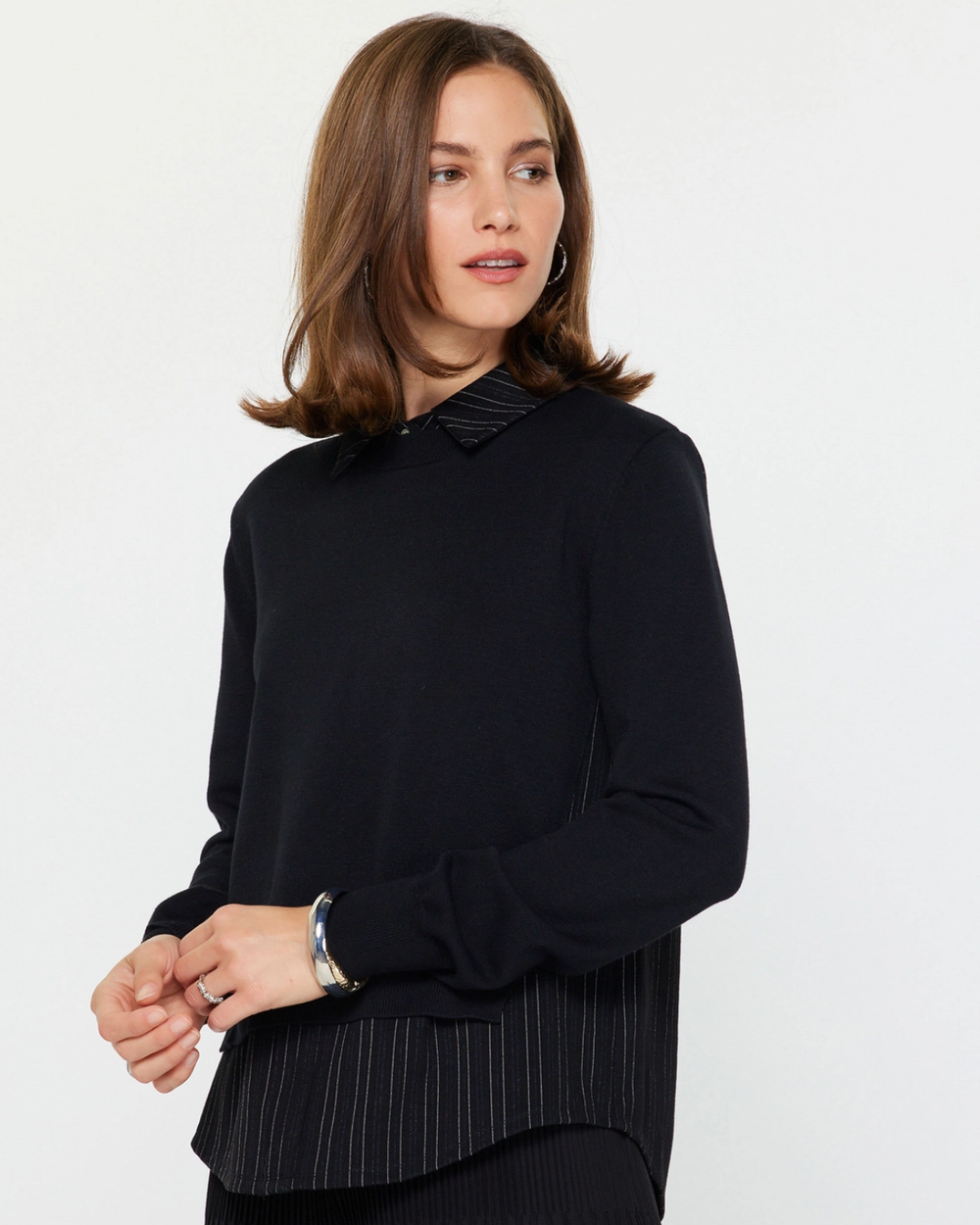 Double the style with this playful woven combo sweater that pairs cozy knit with crisp shirt layers. One piece, two vibes—your new go-to for effortless mixing and matching.