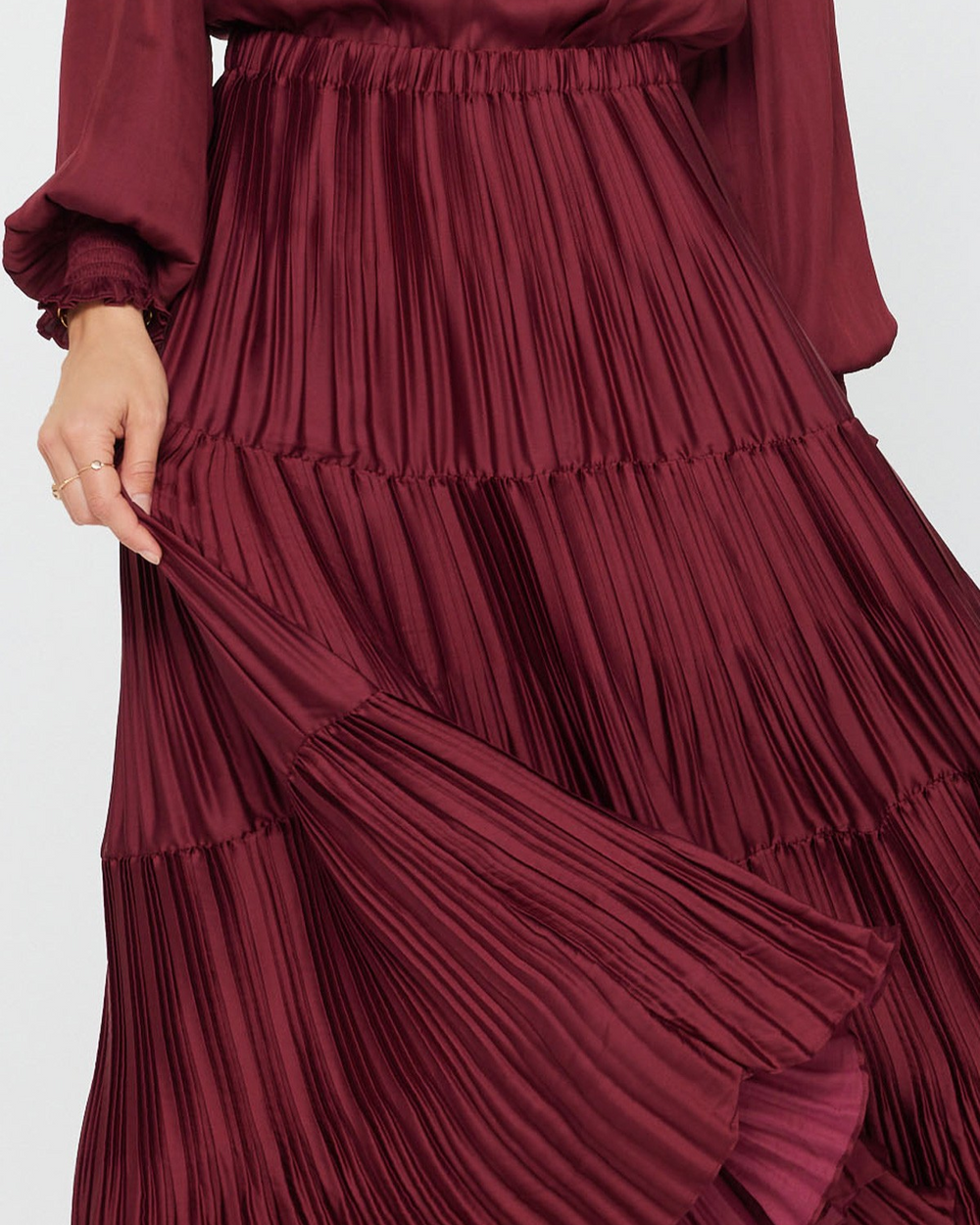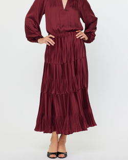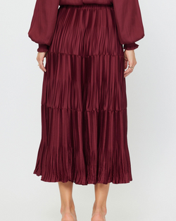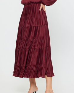 This burgundy pleated tiered skirt adds a flirty flair to any outfit with its flowing three-tier design.