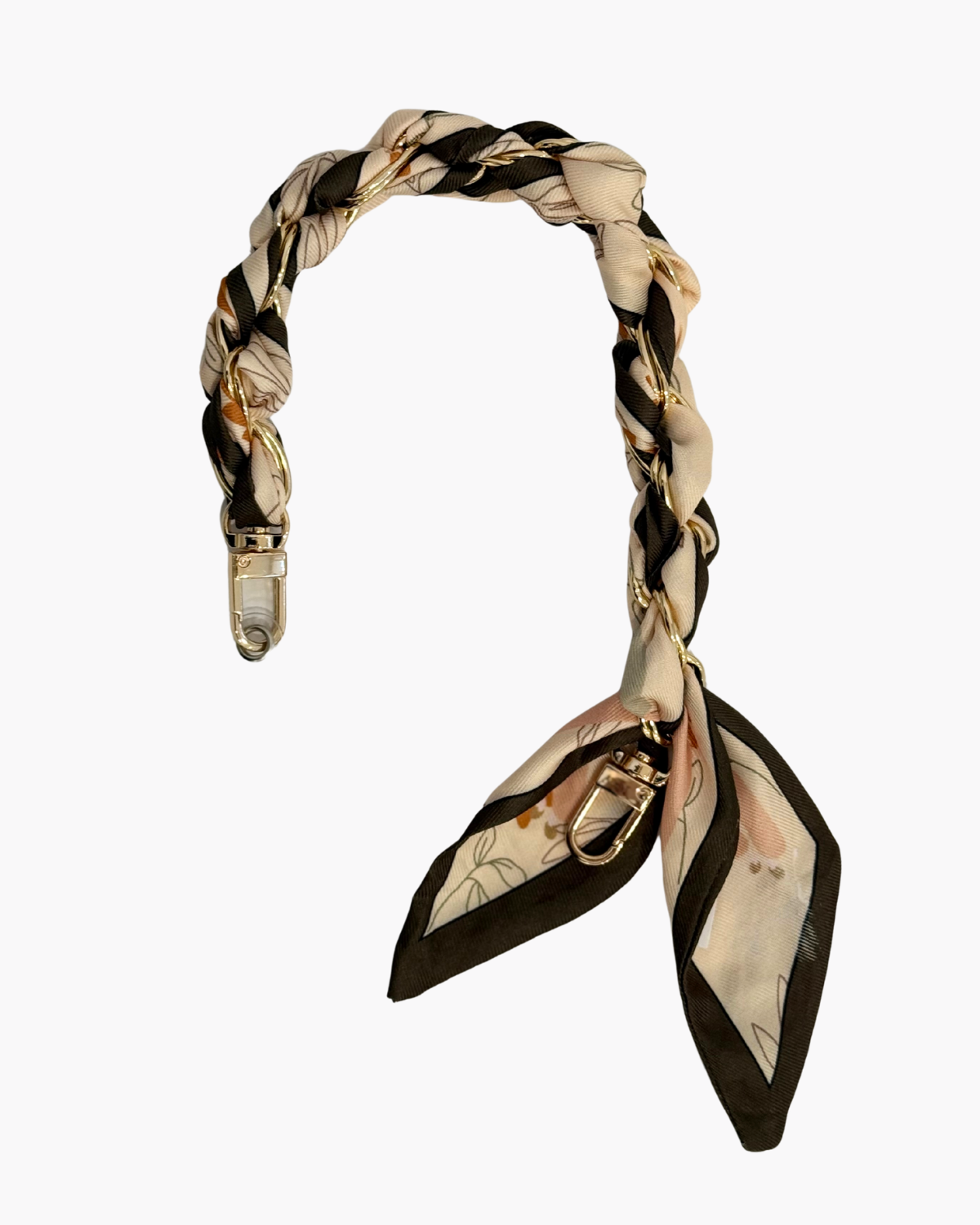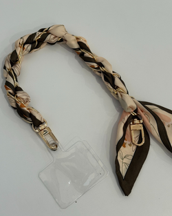 Elevate your phone game with this chic scarf and chain wristlet. Slip your phone into the secure pouch, wrap the silky scarf around your wrist, and let the delicate chain add that perfect touch of glam.