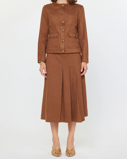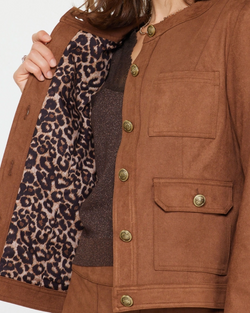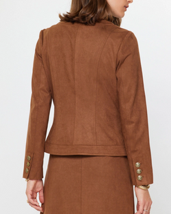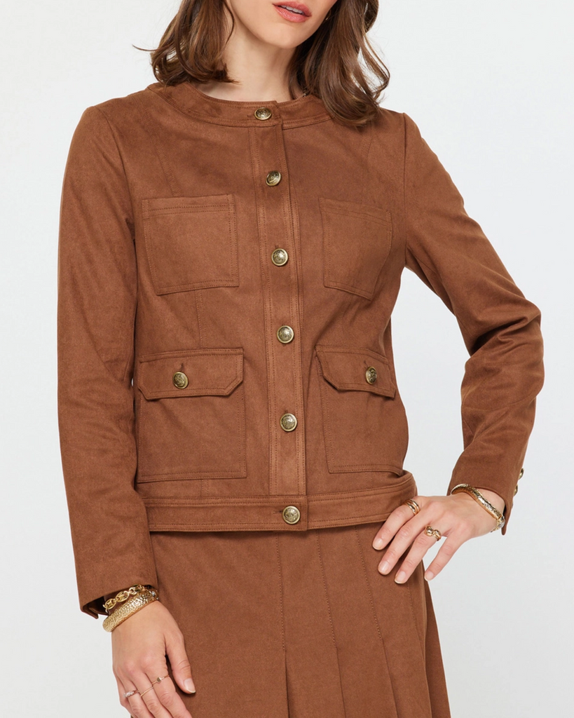 Crafted in rich dark chestnut suede, this jacket features functional pocket detailing for a refined yet practical finish. Its tailored design ensures a sophisticated silhouette perfect for elevated layering.