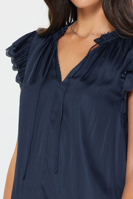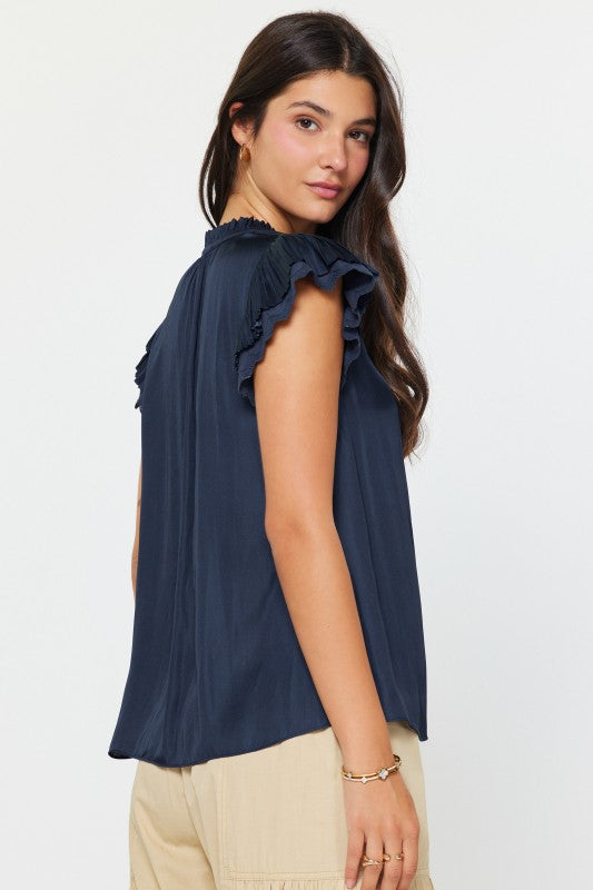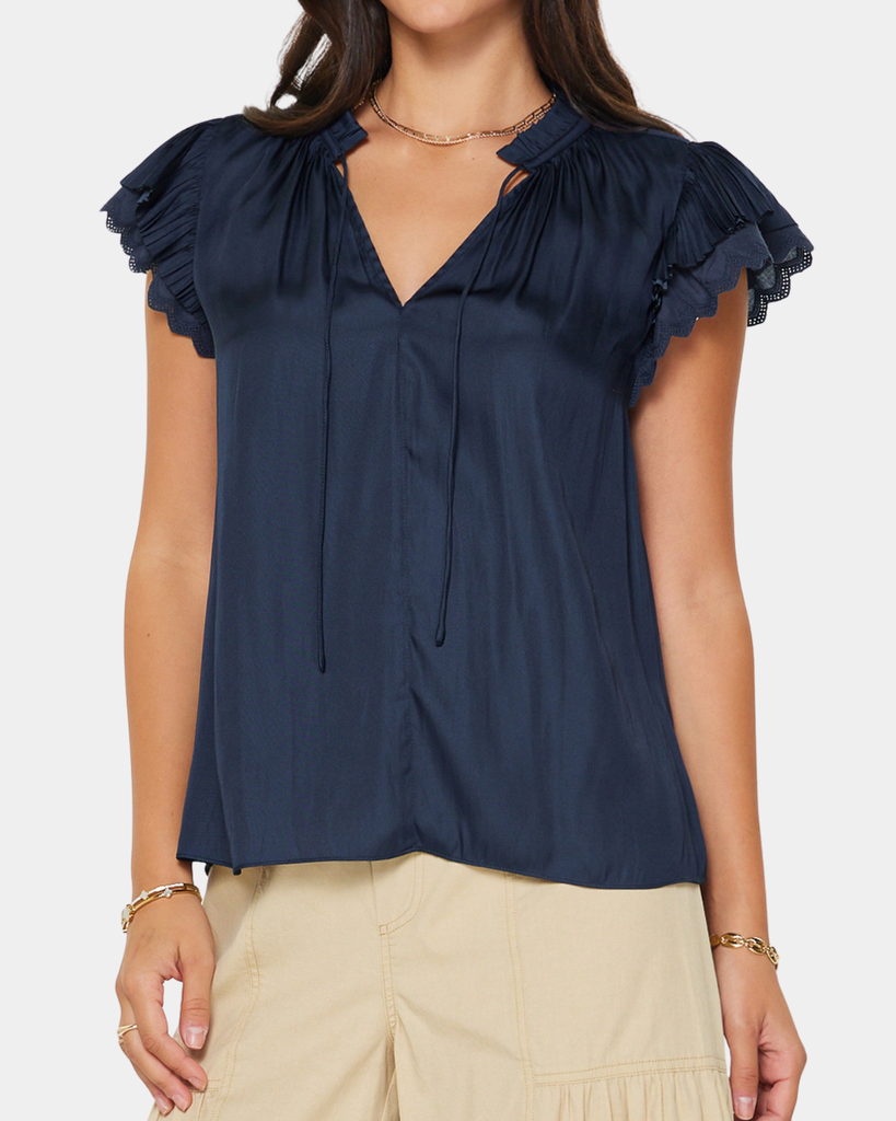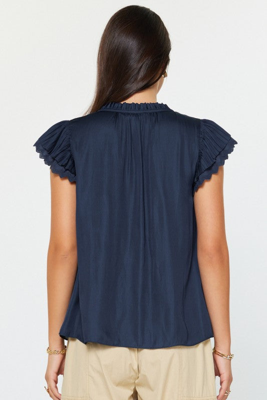 Fluttery sleeves meet effortless style in this navy blouse that's ready for anything. The double flutter detailing adds a touch of whimsy to your everyday wardrobe, while the short sleeves keep things breezy and comfortable.