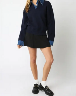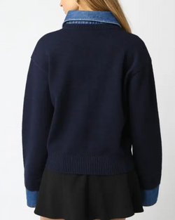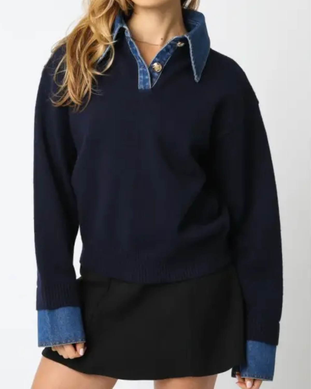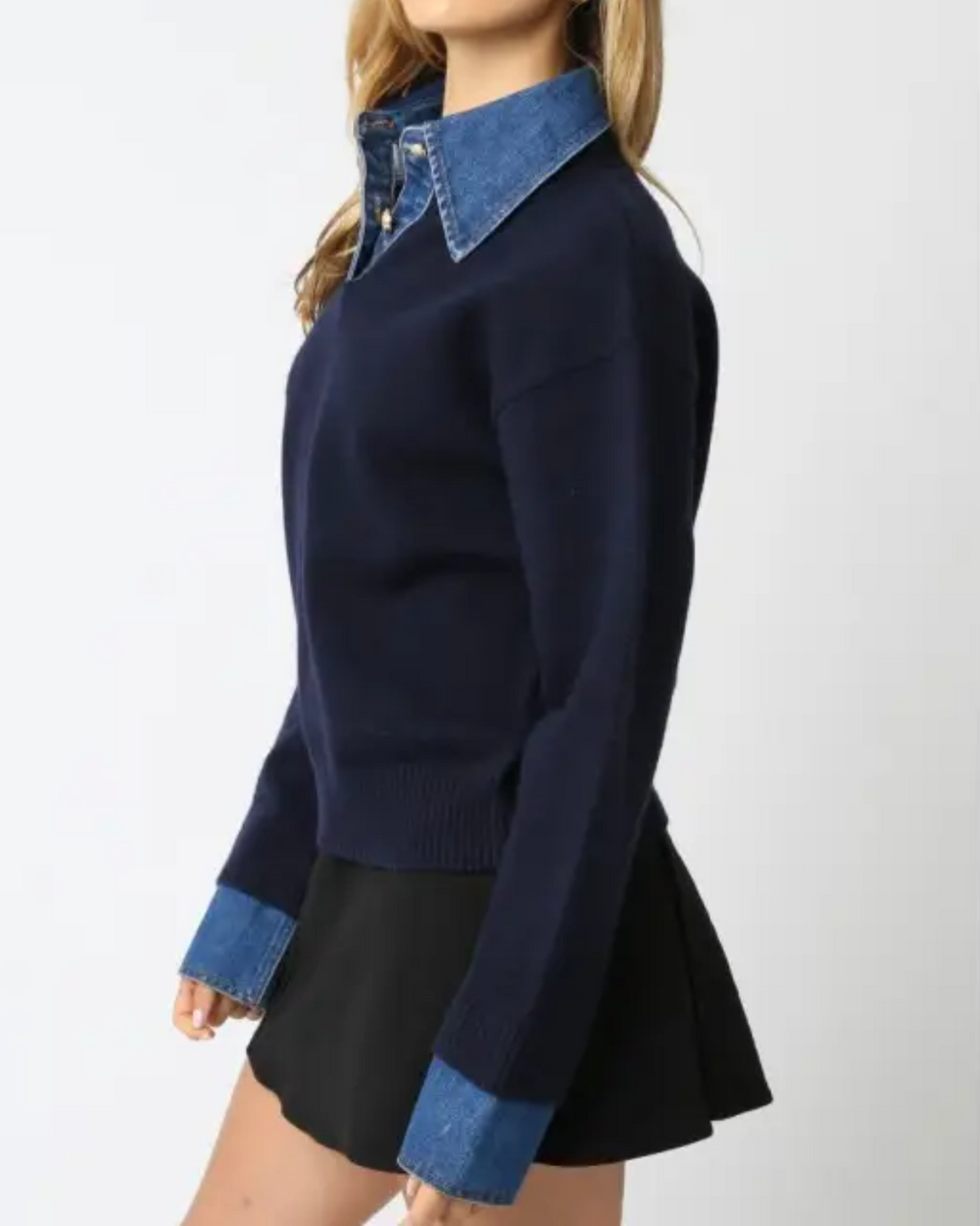 The Triana Denim Knit Top effortlessly fuses a crisp denim wash cuff and collar with soft knit fabric for a stylish layered look—all in one piece. Finished with gleaming gold buttons, it adds a dash of charm that’s both expert in design and delightfully playful.