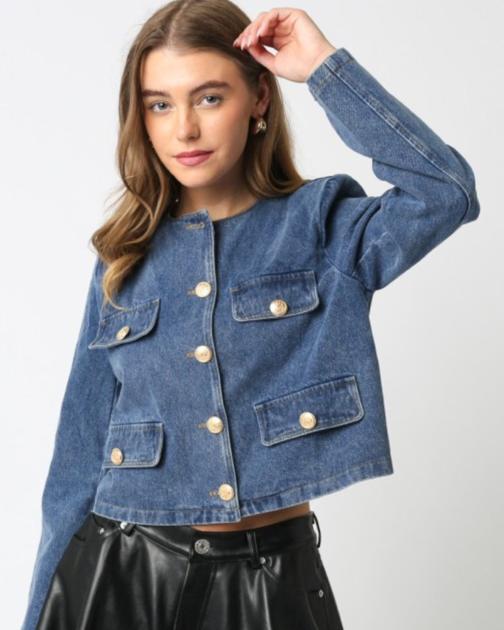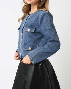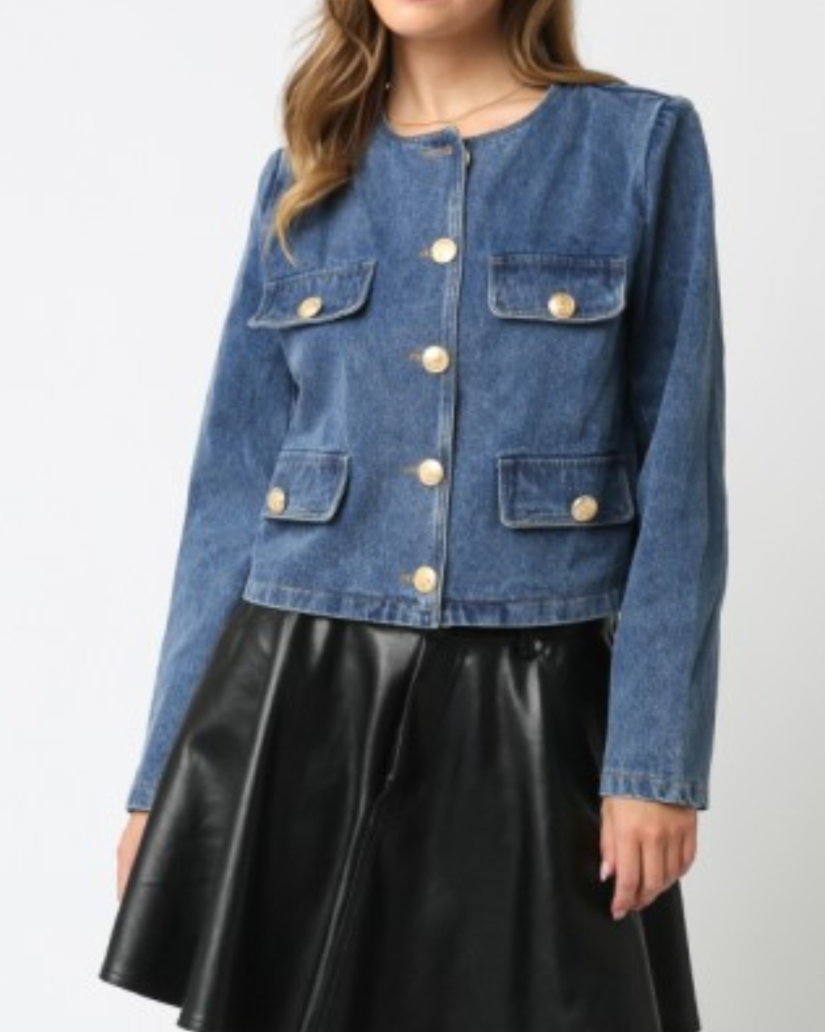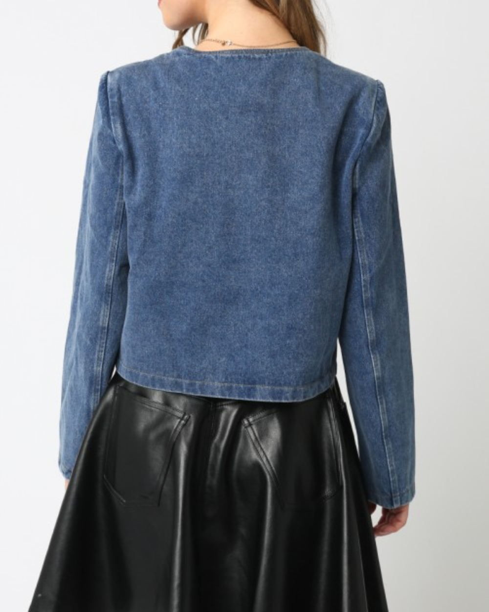 Throw on the Keyla Denim Jacket and instantly level up your vibe! This playful piece combines a crisp button-down front with a relaxed round neck—the perfect blend of cool and comfortable for any occasion.