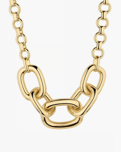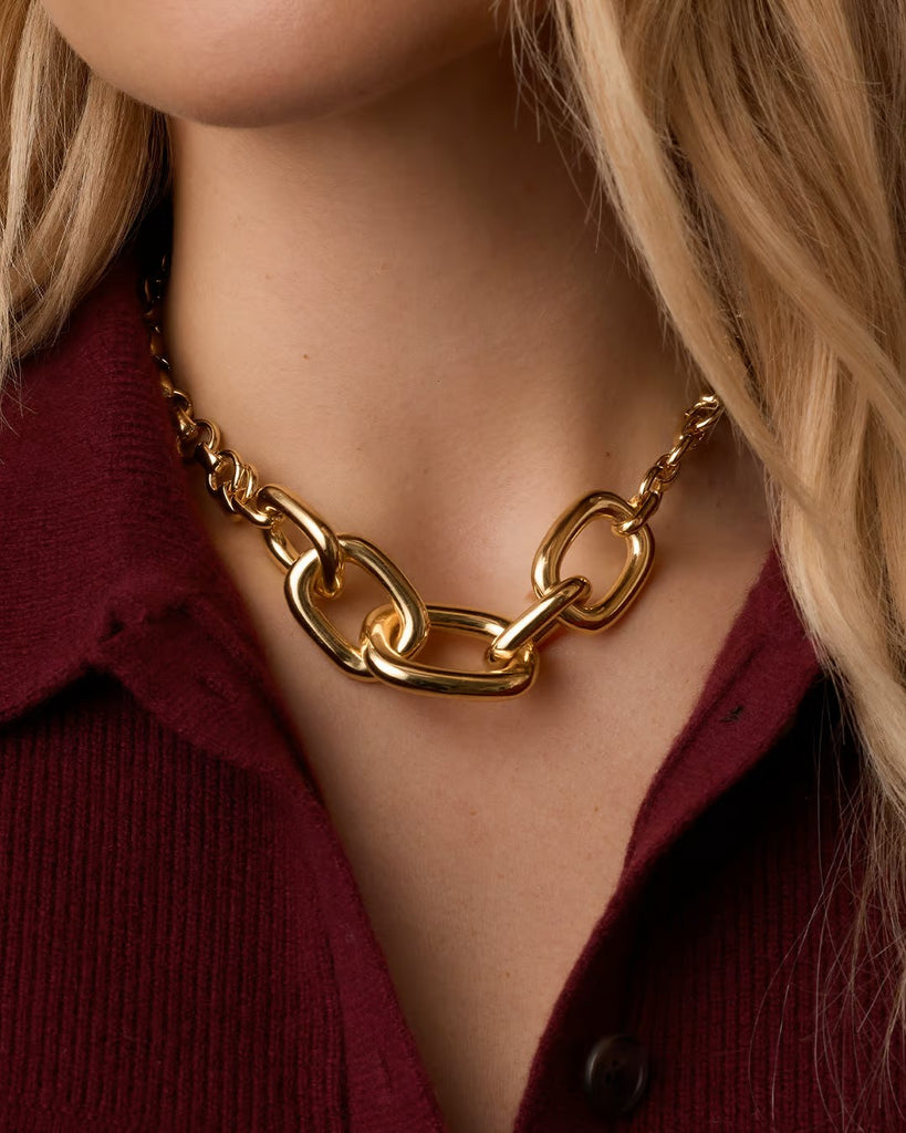 Designed to stand out, this 18k gold plated statement necklace features links in different sizes. Elevate your every day look and wear this with your favorite white tee, or add it as a finishing touch to a night time outfit.