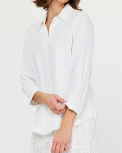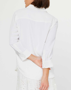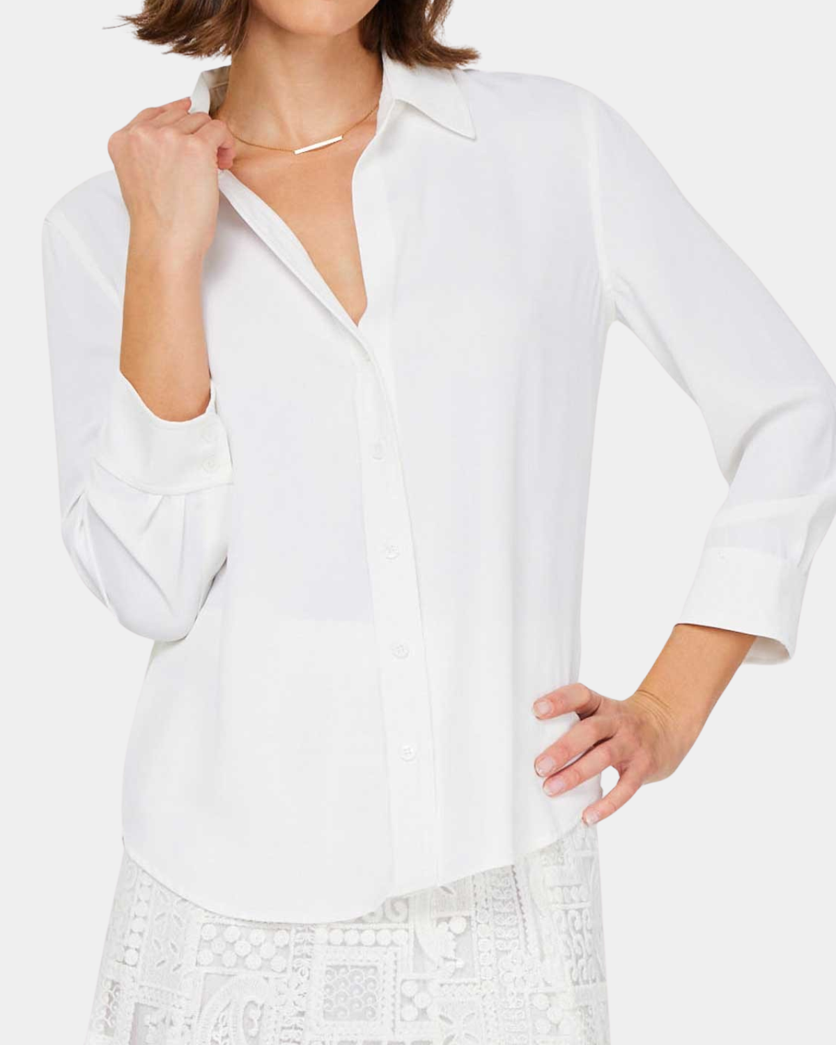 A modern essential for the discerning wardrobe. This crisp white button-down features three-quarter sleeves that bridge casual and formal styling. Clean lines and quality construction make it an ideal layering piece or standalone statement, perfect for creating effortless, polished looks.