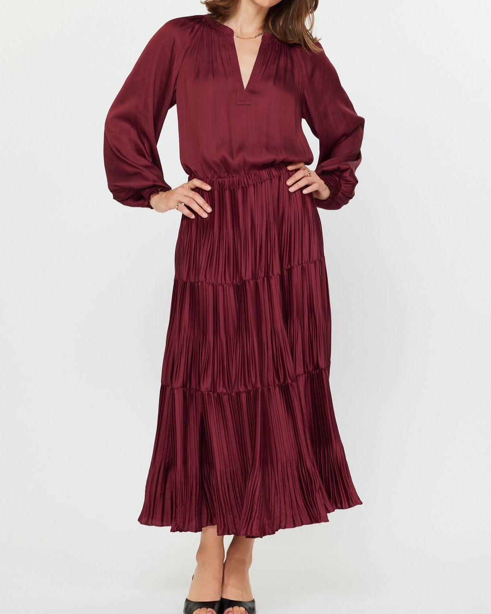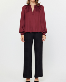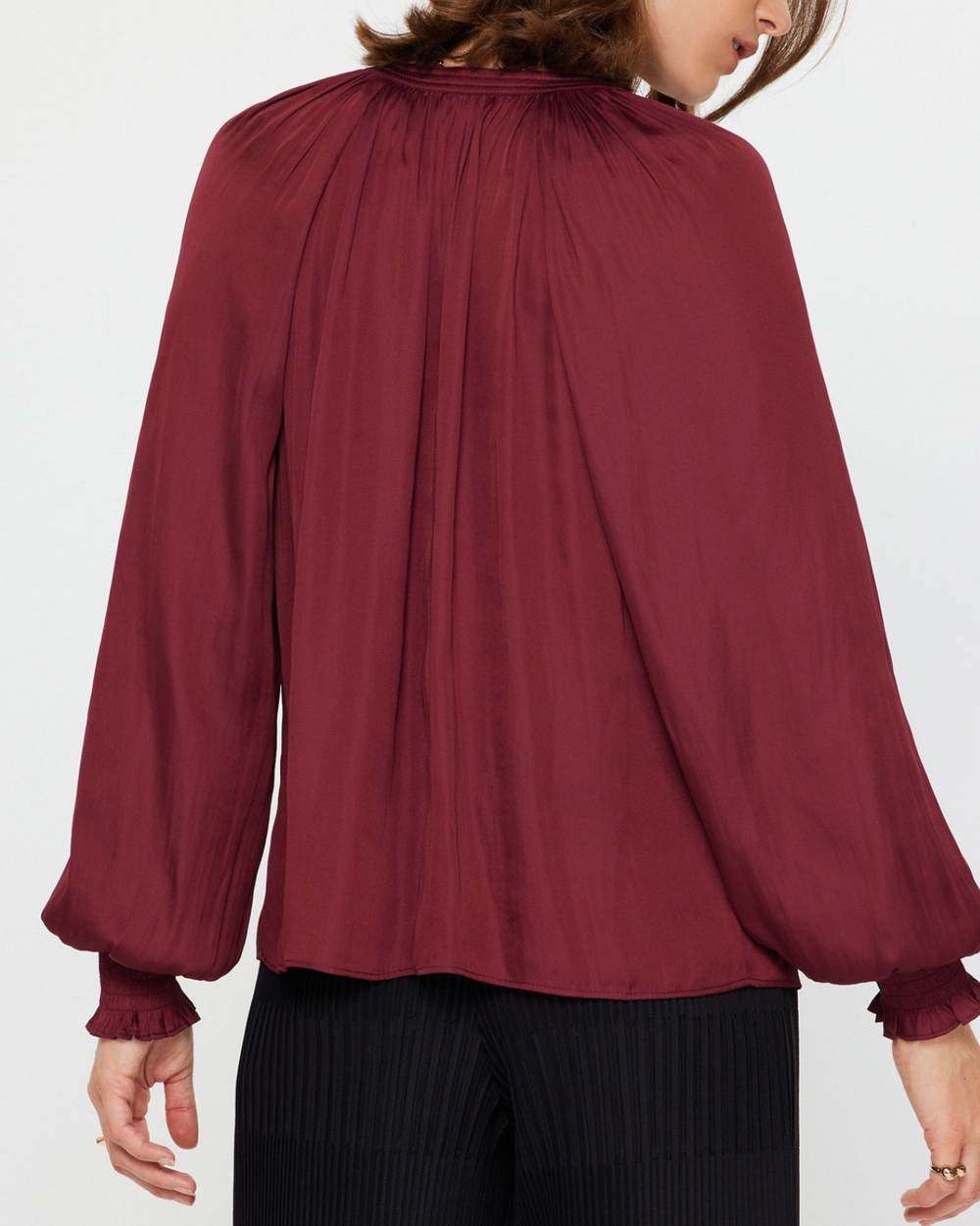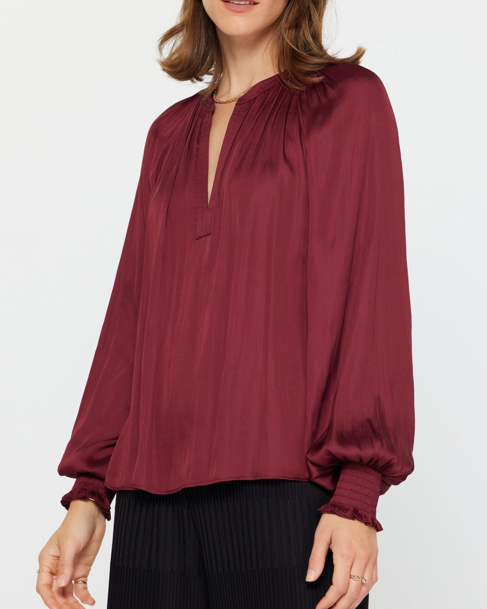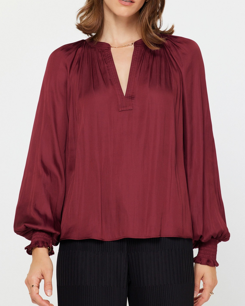 This burgundy long sleeve blouse features a refined split V-neck with a stitched placket and a shirred neckline for elegant detail.