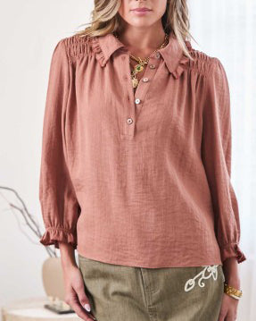 This classic blouse features a collared neckline, button front and ruffle detail at cuff and neck. Smocking at shoulders completes the look. A great top for work or play.