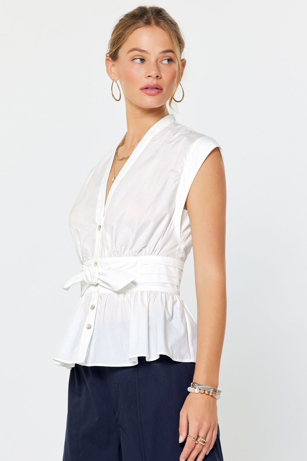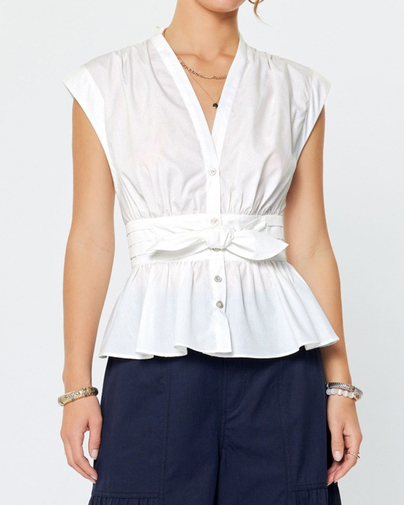 This peplum top features a charming tie waist bow frames the front, while the smocked back waist ensures a comfortable, sculpted fit. The ruffled peplum hem delivers a touch of feminine sophistication to any ensemble.