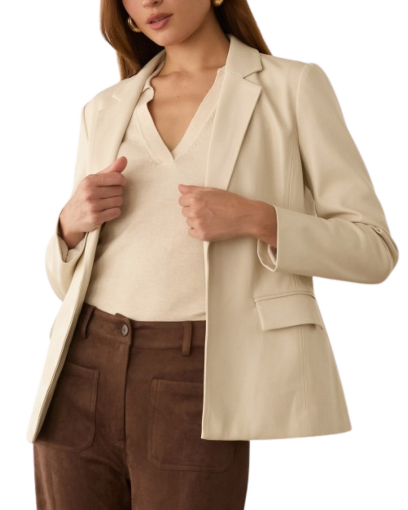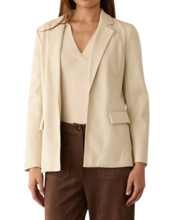 This open-front blazer in soft faux leather delivers a chic and modern vibe. Its clean, simple design adds a touch of playful edge to any outfit, whether you're rocking jeans and a tee by day or dressing up with a sleek dress for the evening.
