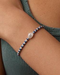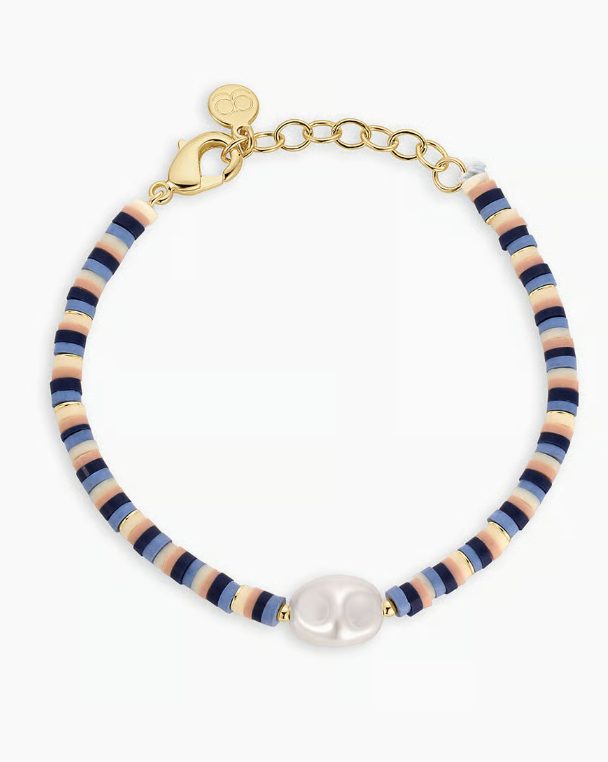 Summer is the season to experiment with a fun, beaded bracelet in unexpected color combinations. This adjustable bracelet features varying shades of blue and looks perfect stacked with your favorite gold and 18k gold plated bracelets.