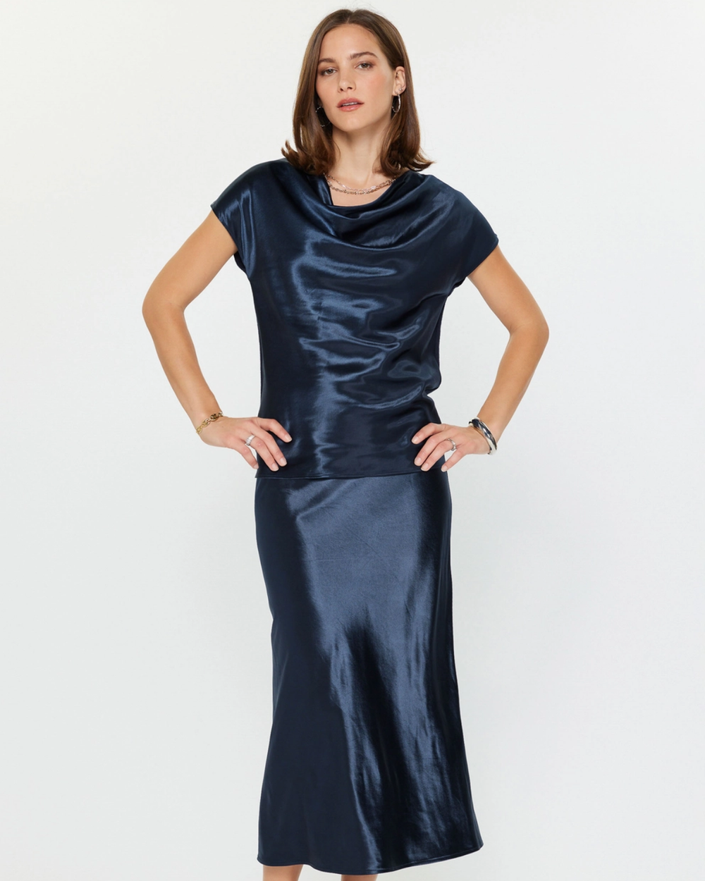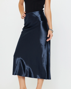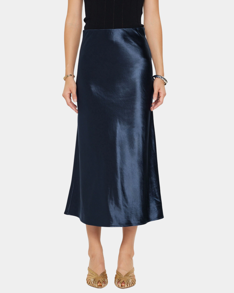 This navy satin midi skirt combines graceful movement with a polished sheen, offering timeless sophistication in a relaxed, wearable silhouette.