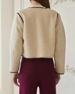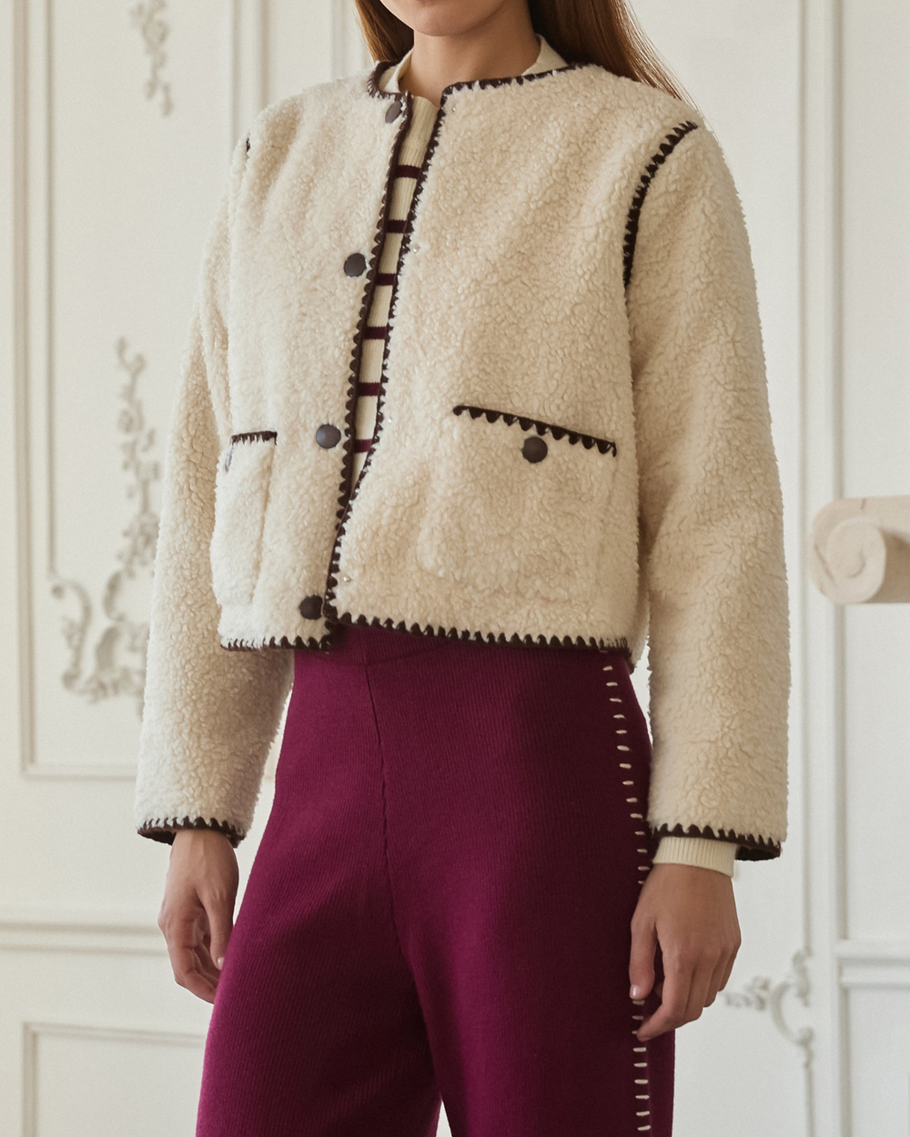 Snuggle up in this cream sherpa jacket that’s as cozy as a hug with its soft, textured fleece. The playful burgundy whipstitch trim and snap-buttons add a pop of charm that makes staying warm seriously stylish.