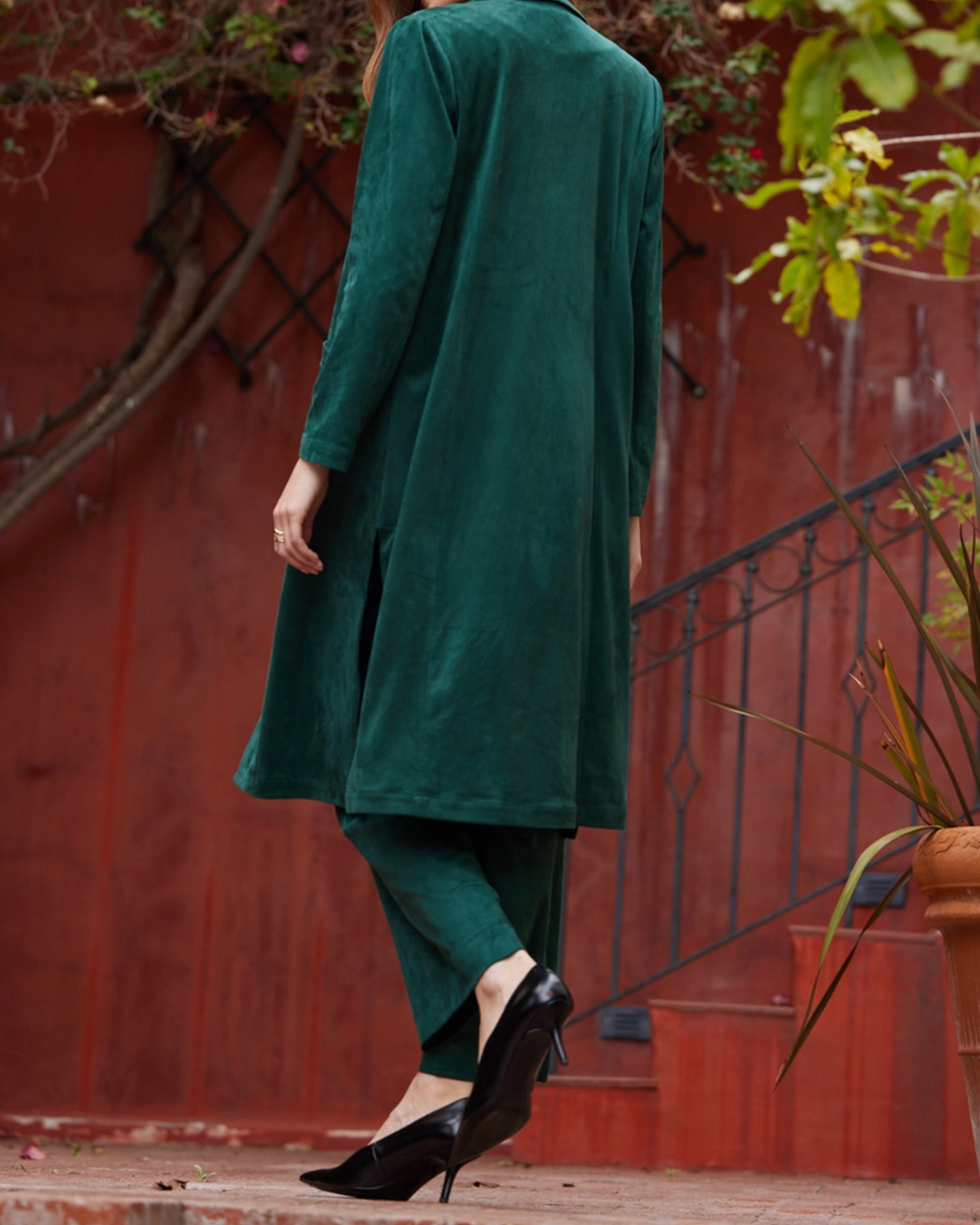 Elevate your wardrobe with the Faux Suede Duster in Hunter Green, featuring a sleek maxi silhouette that drapes effortlessly. Its luxurious texture and rich hue offer timeless sophistication for any occasion.