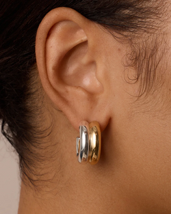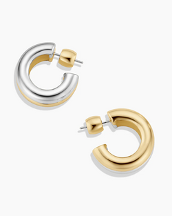 Who says you have to pick a side? These playful hoops mix silver and gold plating, balancing bold style with lightweight comfort to brighten up any outfit.