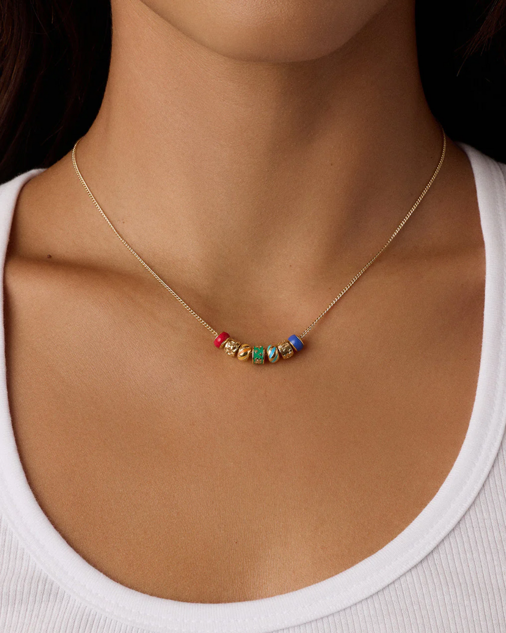 This gold-plated necklace, adorned with vivid enamel accents, features significant symbols that elegantly convey your personal style. Its lightweight design and versatility make it a refined accessory that complements any look while sparking quiet intrigue.
