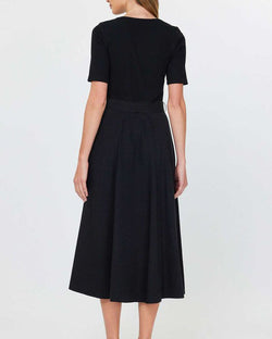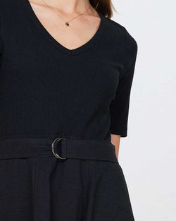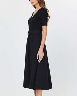 This timeless black midi dress features a v-neck ribbed knit top with short sleeves and a woven a-line flair skirt combined into one look of a polished dress. Complete with a belted waist, this dress is sophisticated and flattering.