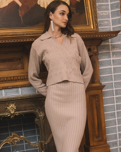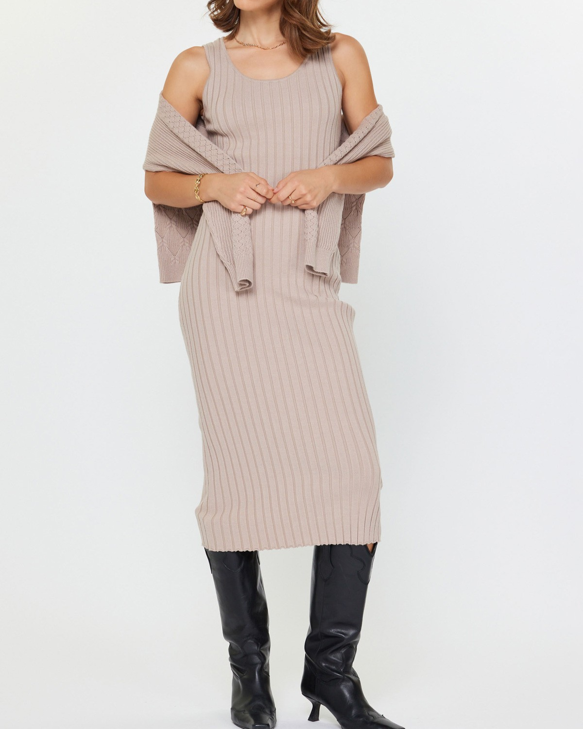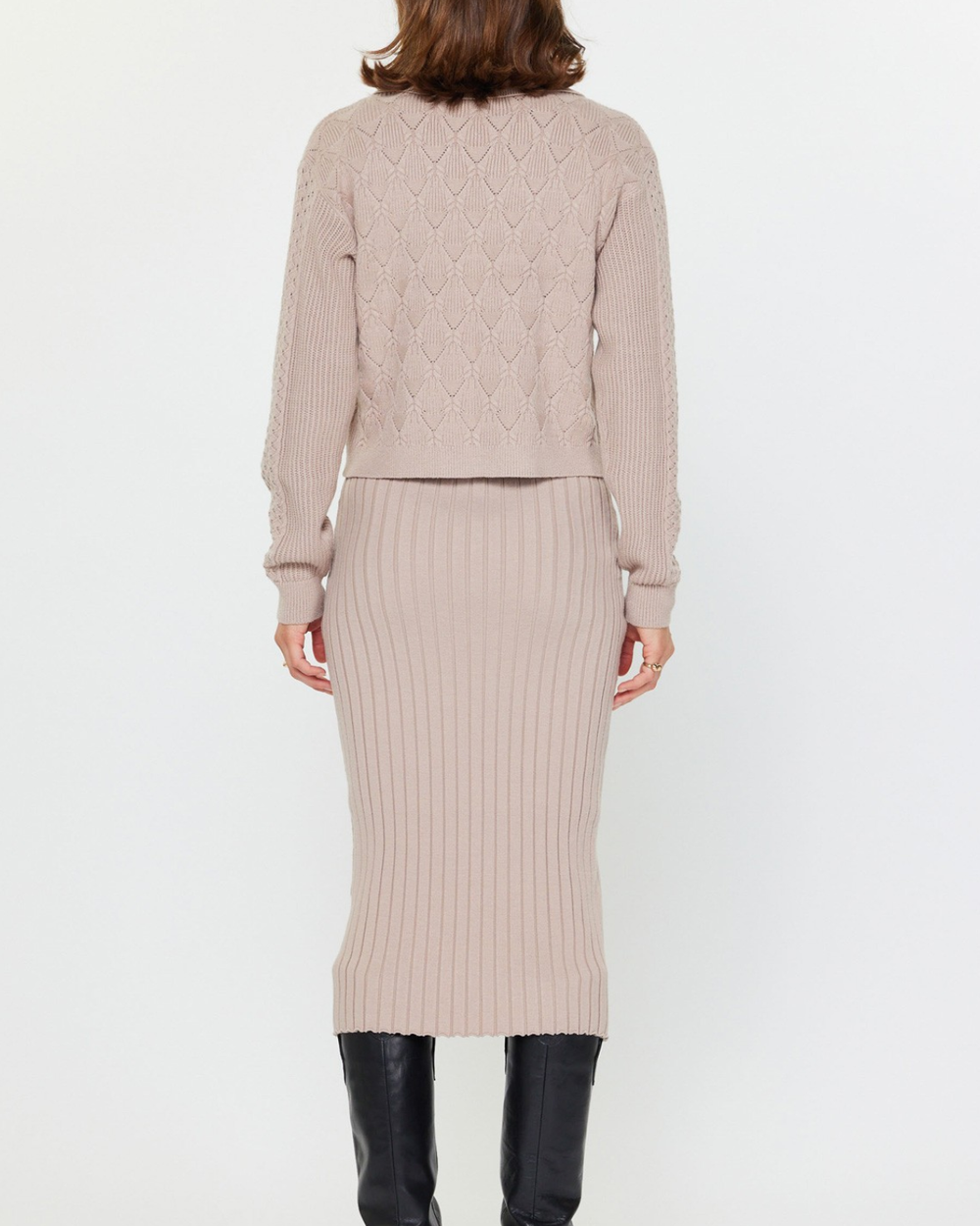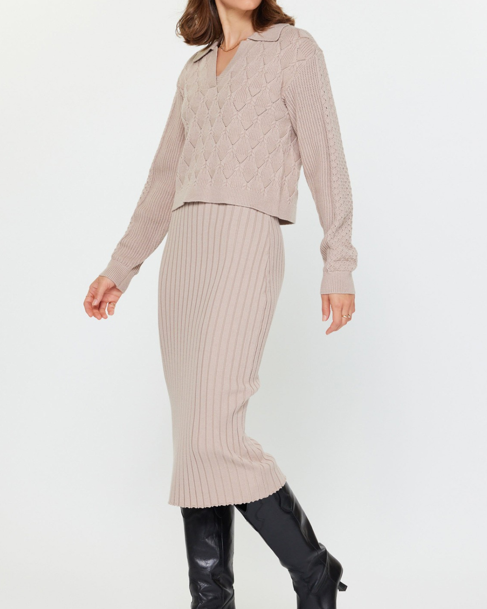 Layer effortlessly with this versatile twofer sweater dress in taupe. The clever design combines a fitted sweater top with a flowing midi skirt, offering refined style for any occasion. Perfect for transitional seasons, this piece delivers understated elegance with minimal effort.