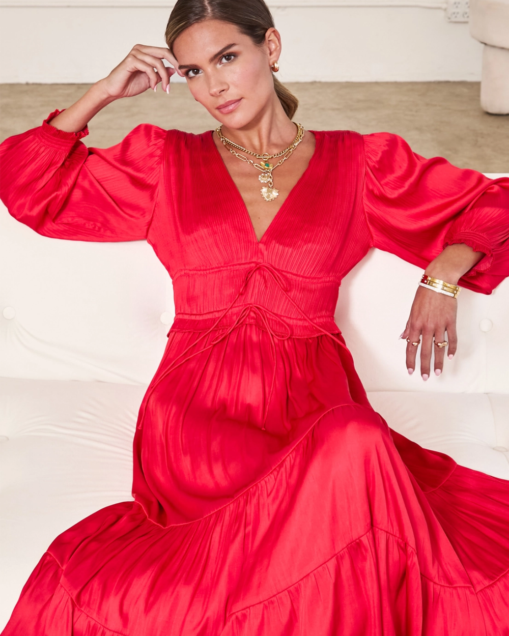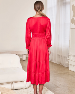 Elevate your wardrobe with this refined red V-neck tiered dress. The gracefully layered design offers a polished aesthetic perfect for formal gatherings or elevated casual occasions. A timeless piece that exudes quiet confidence and enduring style.