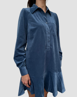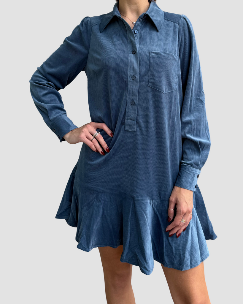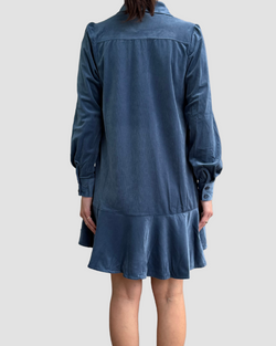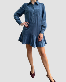 This steel blue suede mini dress dazzles with fun charm, boasting long sleeves and a flirty length that’s just right.