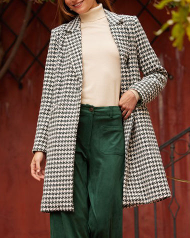 Elevate your wardrobe with this Green and Ivory Houndstooth Long Sleeve Coat. Featuring a straight, tailored fit and a single prominent front button, it offers a refined silhouette with a structured notched lapel collar. This timeless piece blends retro charm with modern sophistication, perfect for pairing with dresses, trousers, or jeans. Whether for professional settings or casual outings, it adds a polished, effortlessly chic touch to any ensemble.