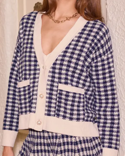 Elevate your fall wardrobe with this sophisticated houndstooth cardigan in navy and cream. Featuring a classic button-down front with elegant gold buttons and long sleeves, it offers both warmth and timeless style. Perfect for layering, this cardigan adds a refined touch to any ensemble.