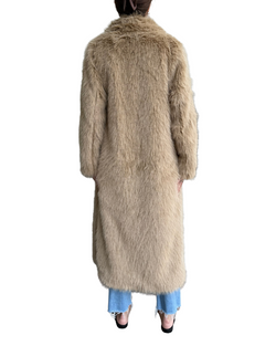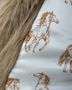 Stay warm and stylish in this playful camel faux fur maxi coat, featuring a charming horse detail hidden in the lining. Perfect for adding a fun twist to your winter wardrobe.