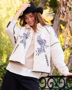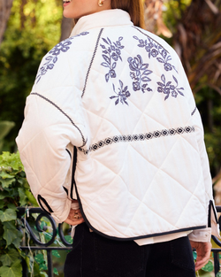 This cream quilted jacket brings playful charm with its bold black floral embroidery on every angle—from sleeves to pockets. Relaxed fit and dropped shoulders make it as cozy as it is stylish.