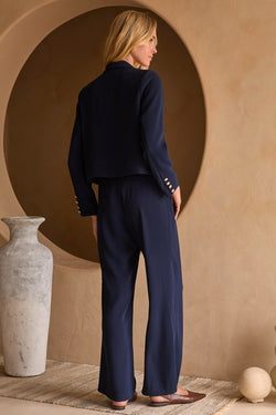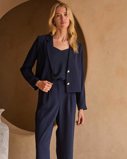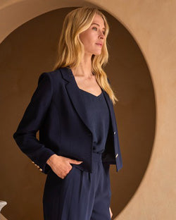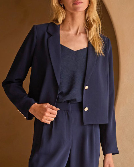 Elevate your wardrobe with this navy blue cropped blazer, designed with a sleek silhouette and long sleeves for a refined look. Its tailored fit enhances your shape while offering versatile layering options, perfect for both professional settings and stylish evenings out.