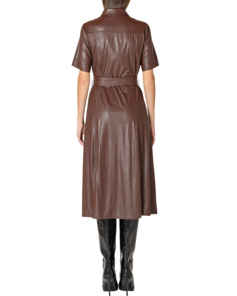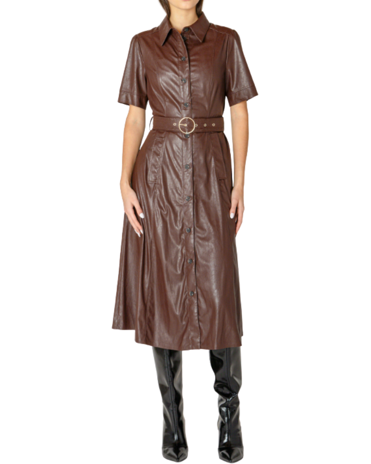 Slip into boldness with this belted vegan leather dress in rich mahogany, designed to turn heads and boost confidence. Its sleek fit and adjustable belt make it the perfect playful pick for day-to-night adventures.