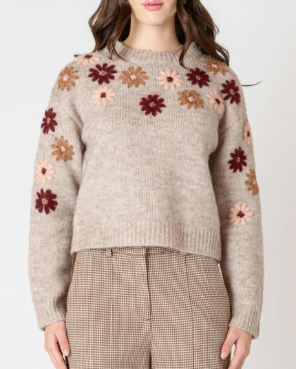 This crewneck sweater in a warm taupe hue features delicate floral applique detailing, offering a distinctive touch to your fall wardrobe. Crafted from soft fabric, it ensures comfortable wear while adding subtle elegance to everyday looks. Its unique design makes it a versatile piece perfect for seasonal layering.