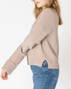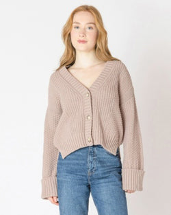 This textured cardigan features a cuffed sleeve detail, a button down front and a v-neckline. A wardrobe staple that can be worn buttoned as a top or open and layered over a top, tee or dress.
