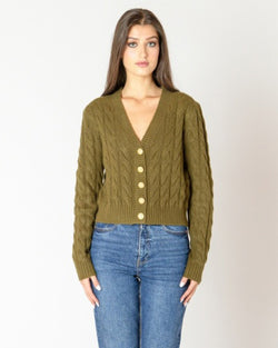 This soft cable knit cardigan features a v-neckline and gold button detailing. Leave it buttoned and wear as a top or leave it open and layer over dresses and tees. A fall staple!