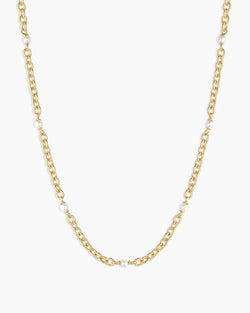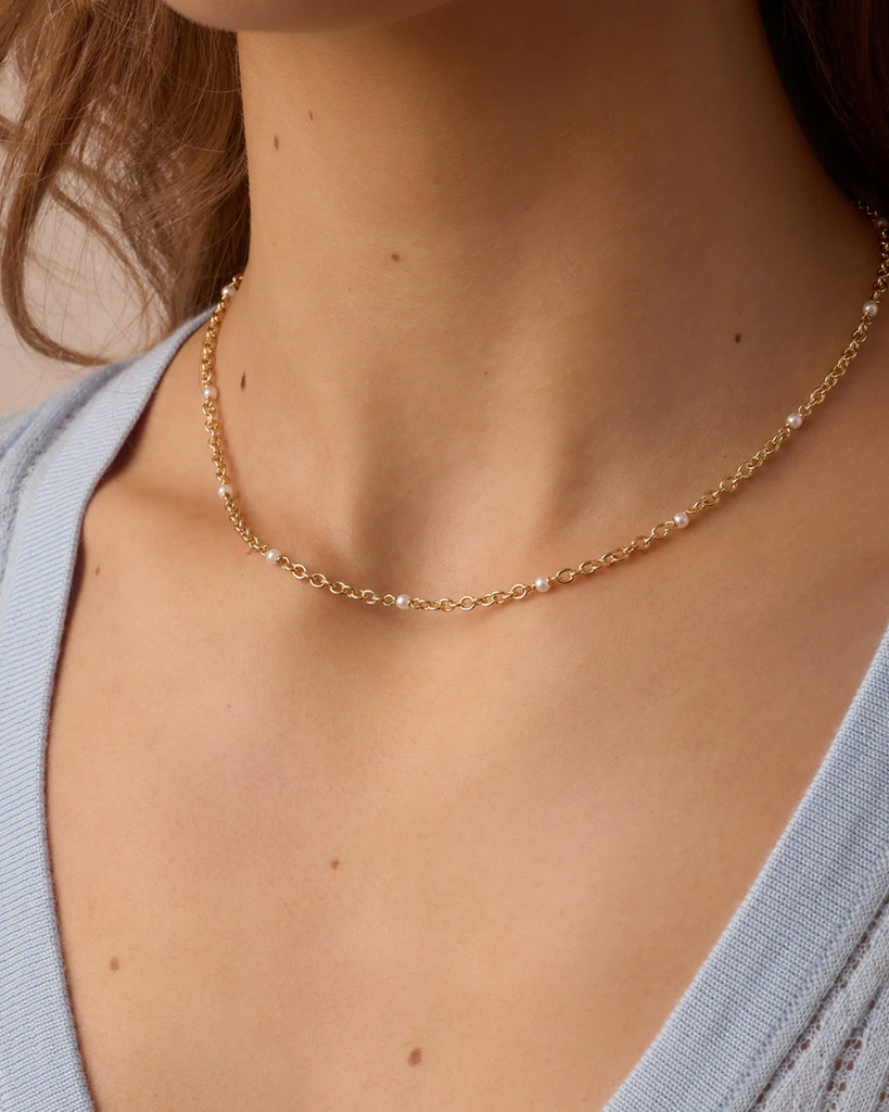 A synthetic pearl necklace for a clean, modern take on a classic. Designed to layer with your everyday chains, it adds a soft shine to the necklaces you already wear—without changing your whole look. Wear it with your go-to chains to break up an all-gold stack in the easiest way.