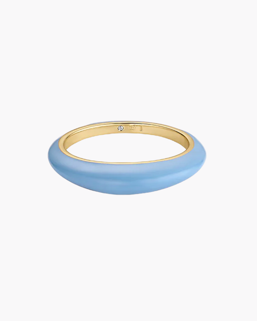 Delicate 18k gold-plated ring with soft chambray enamel detailing. Perfect for stacking with your everyday gold pieces, this Lou Ring adds subtle seasonal color without overwhelming your look. Lightweight, wearable, and designed to complement classic bands and diamond rings effortlessly.