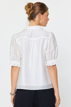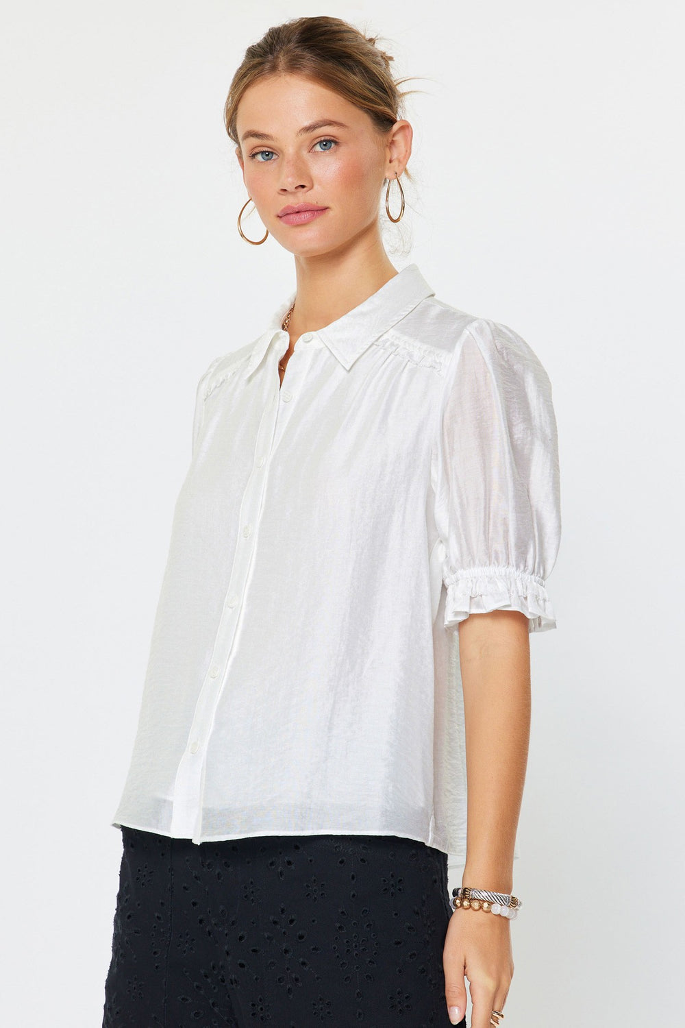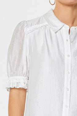 Crisp white short-sleeve top designed for effortless versatility. This wardrobe essential pairs seamlessly with everything from tailored trousers to casual denim, making it an indispensable piece for any occasion.
