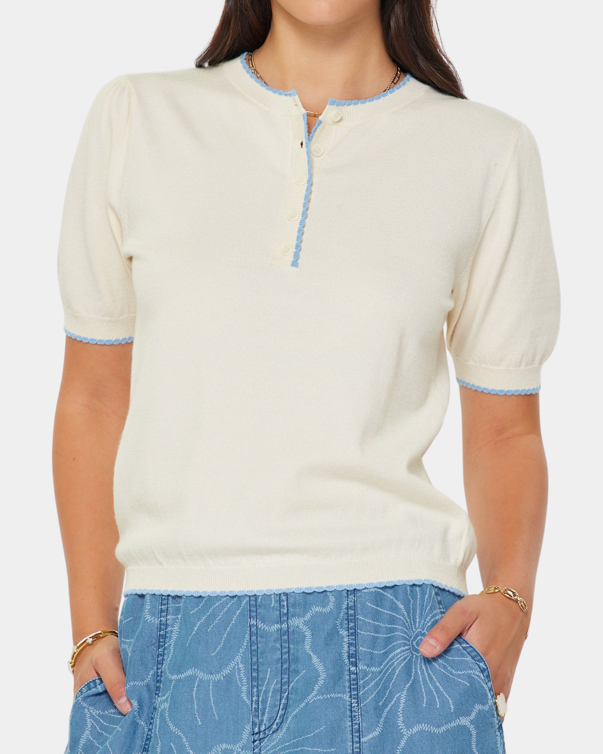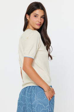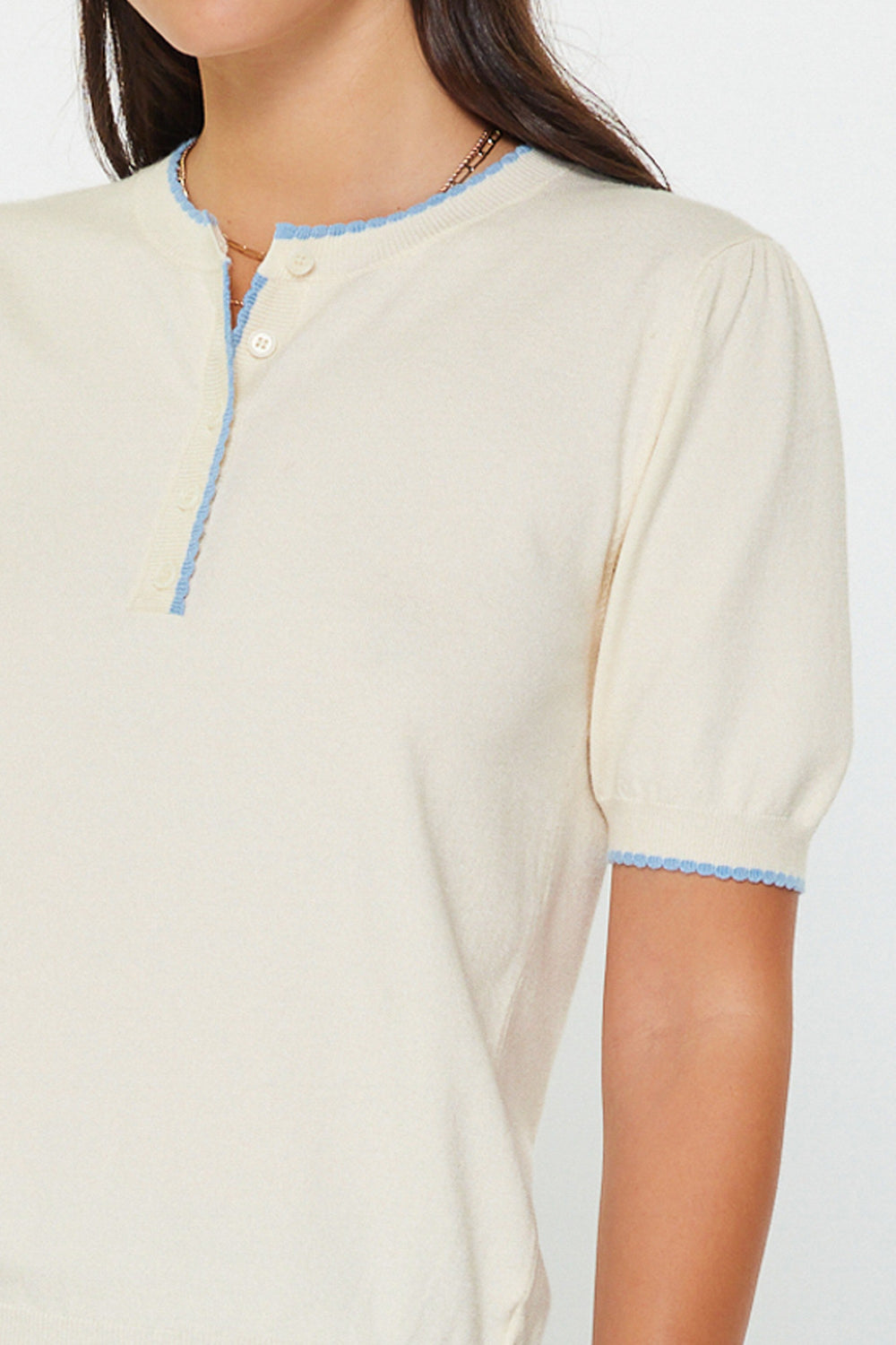 This short sleeve sweater combines comfort and style with its contrasting edges in a versatile ivory color. Perfect for any occasion, it's a wardrobe essential that will keep you looking chic and feeling cozy.