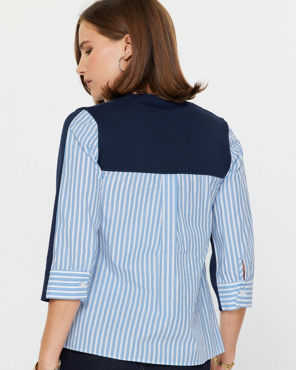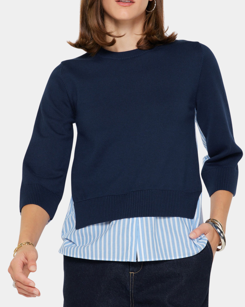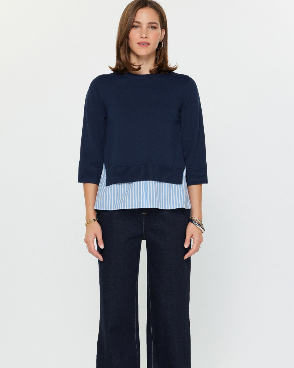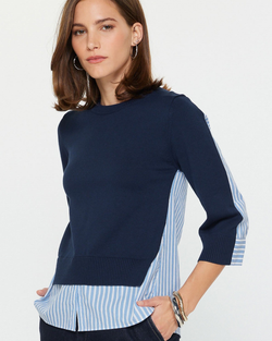 This navy striped sweater brings the fun with mixed media fabrics that create surprising texture contrasts. The blend of materials keeps it interesting while the timeless stripes stay forever chic.