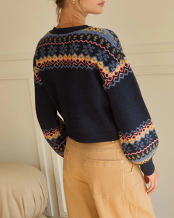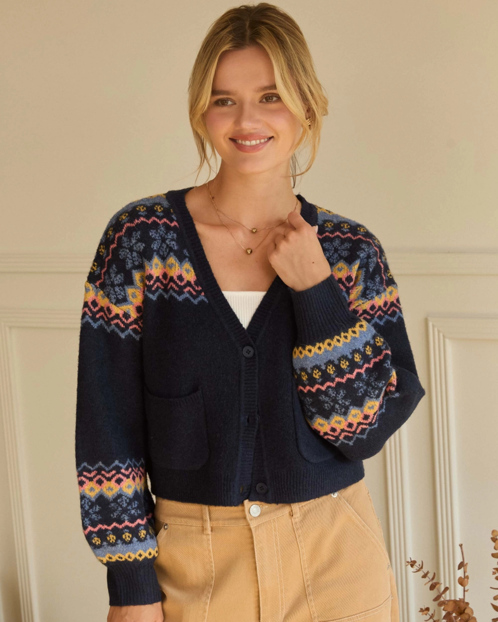 This Fair Isle cardigan brings heritage charm and cozy warmth to your wardrobe. Soft knit fabric with classic intarsia patterns layers beautifully over dresses or pairs perfectly with jeans for effortless style.